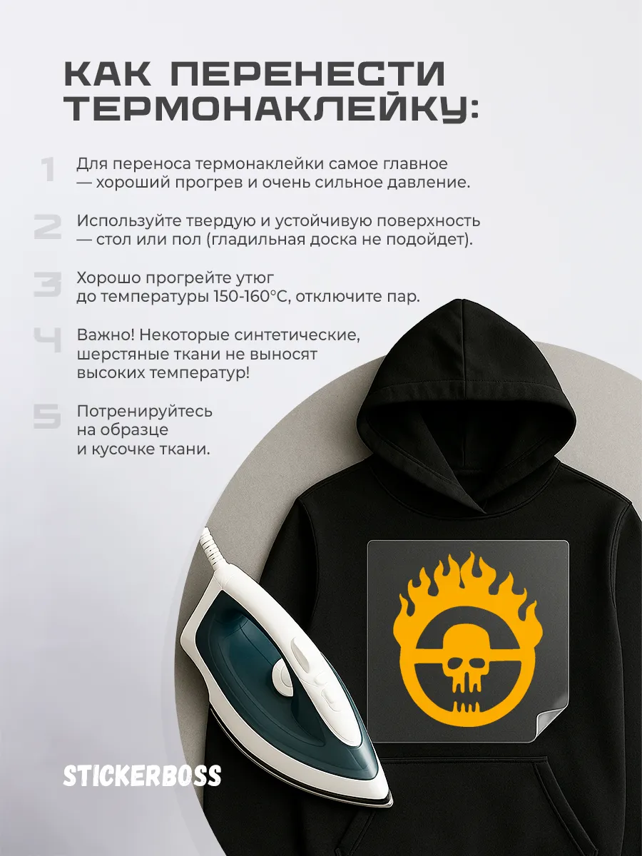 Разместите наклейку на поверхности ткани, накройте её бумагой или тонкой тканью, плавно проглаживайте утюгом в течение нескольких секунд, затем дайте остыть. По завершении проверьте крепление по краям.