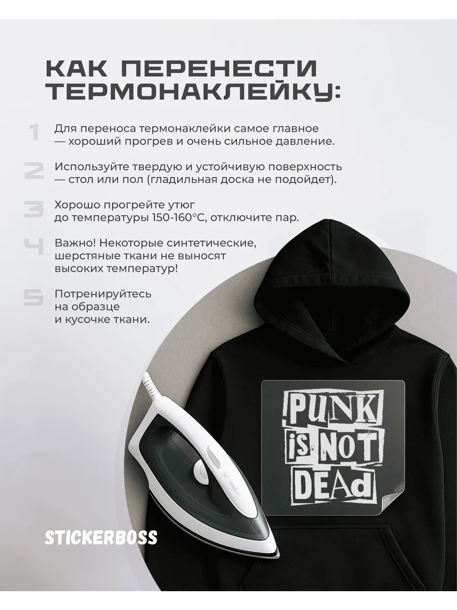 Термонаклейка на одежду с надписью Punk is not dead — стильное решение для гардероба. Наклейка создаёт индивидуальный образ, легко наносится утюгом и сохраняет внешний вид при носке. Износостойкость, эластичность и невыцветаемость делают её продолжительным элементом декора.