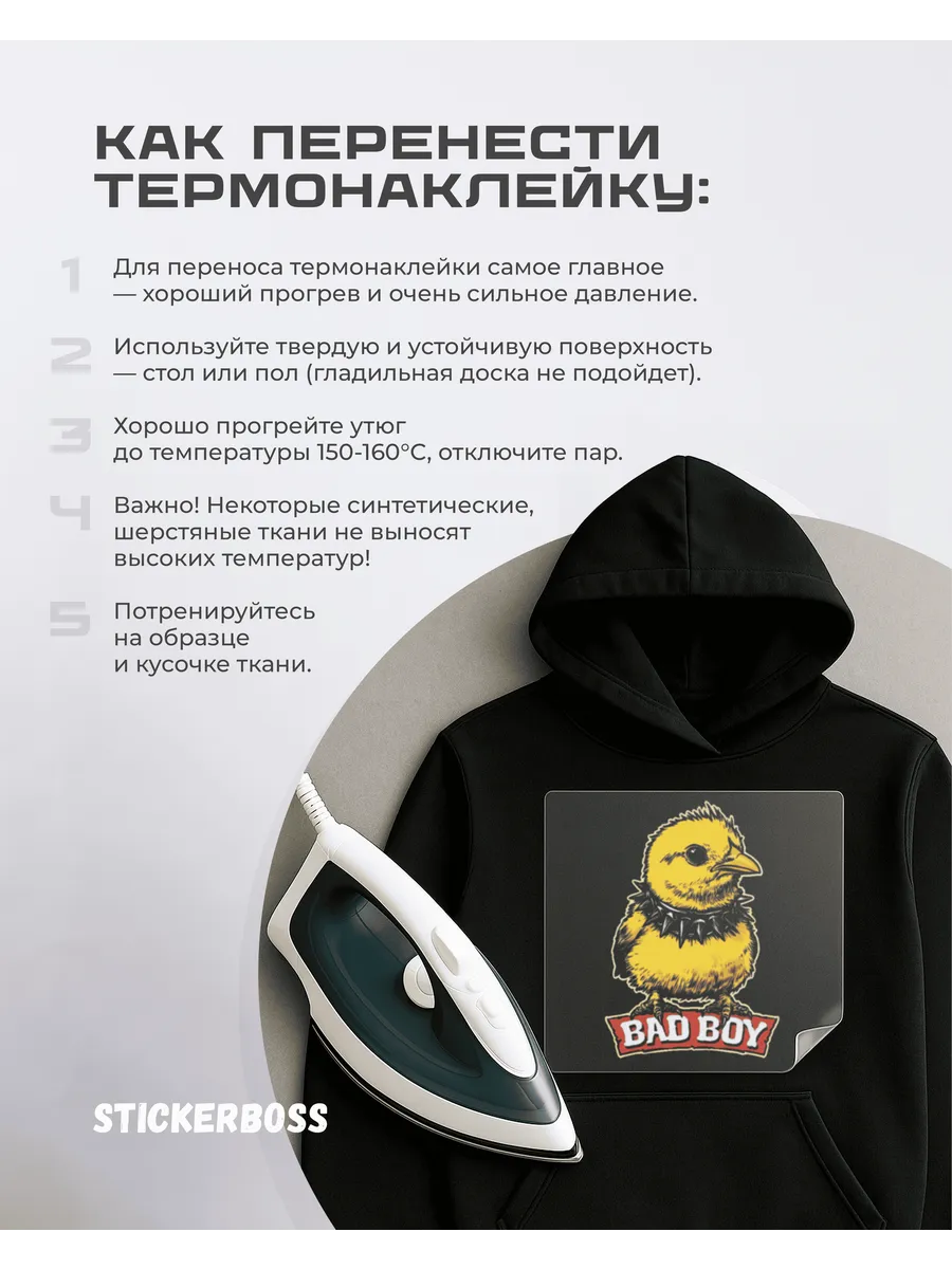 Термонаклейка на одежду — это термотрансферная аппликация, которая наносится утюгом и закрепляется клеевым слоем под действием тепла. Такой способ позволяет обновлять гардероб без сложной обработки ткани, сохраняя внешний вид вещей длительное время.