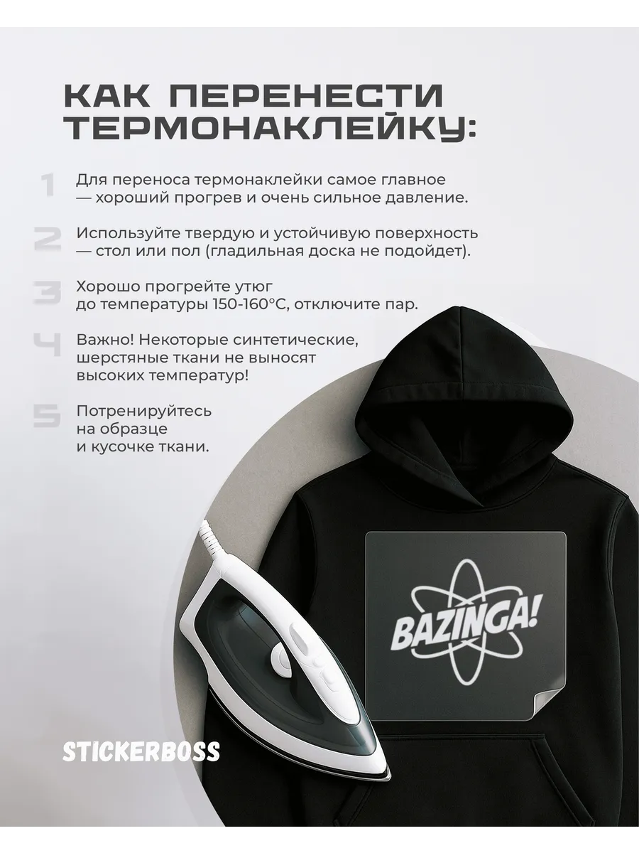 Разместите наклейку на ткани по задумке, затем плотно прижмите утюгом так, чтобы тепло активировало клей и обеспечило надежное сцепление с тканью. Дайте изделию остыть перед использованием.
