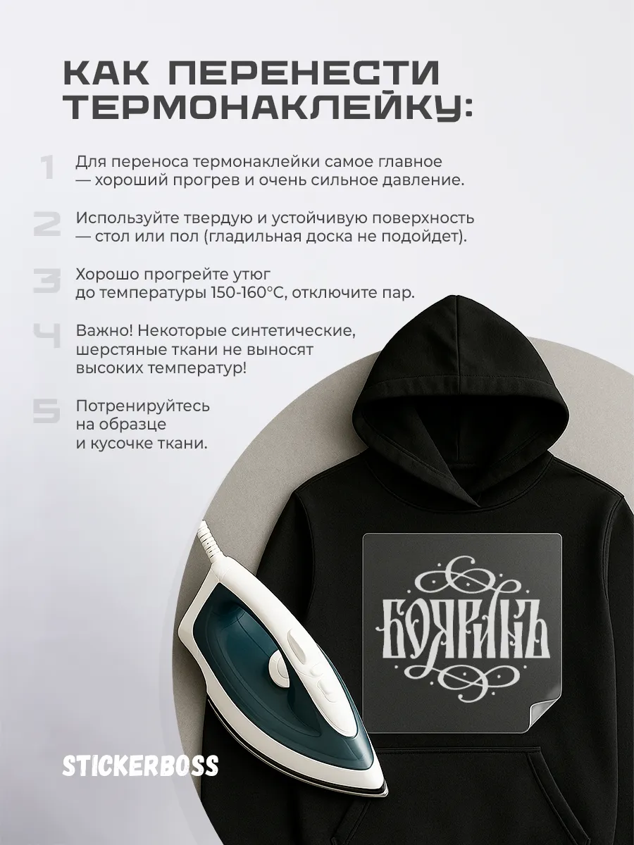 Термонаклейка термотрансфер на одежду БояринЪ калиграфия 59 представляет собой современное решение для украшения гардероба. Наклейка наносится на ткань с помощью утюга, после чего закрепляется термоклеевой подложкой, обеспечивая прочное сцепление и долговечность.