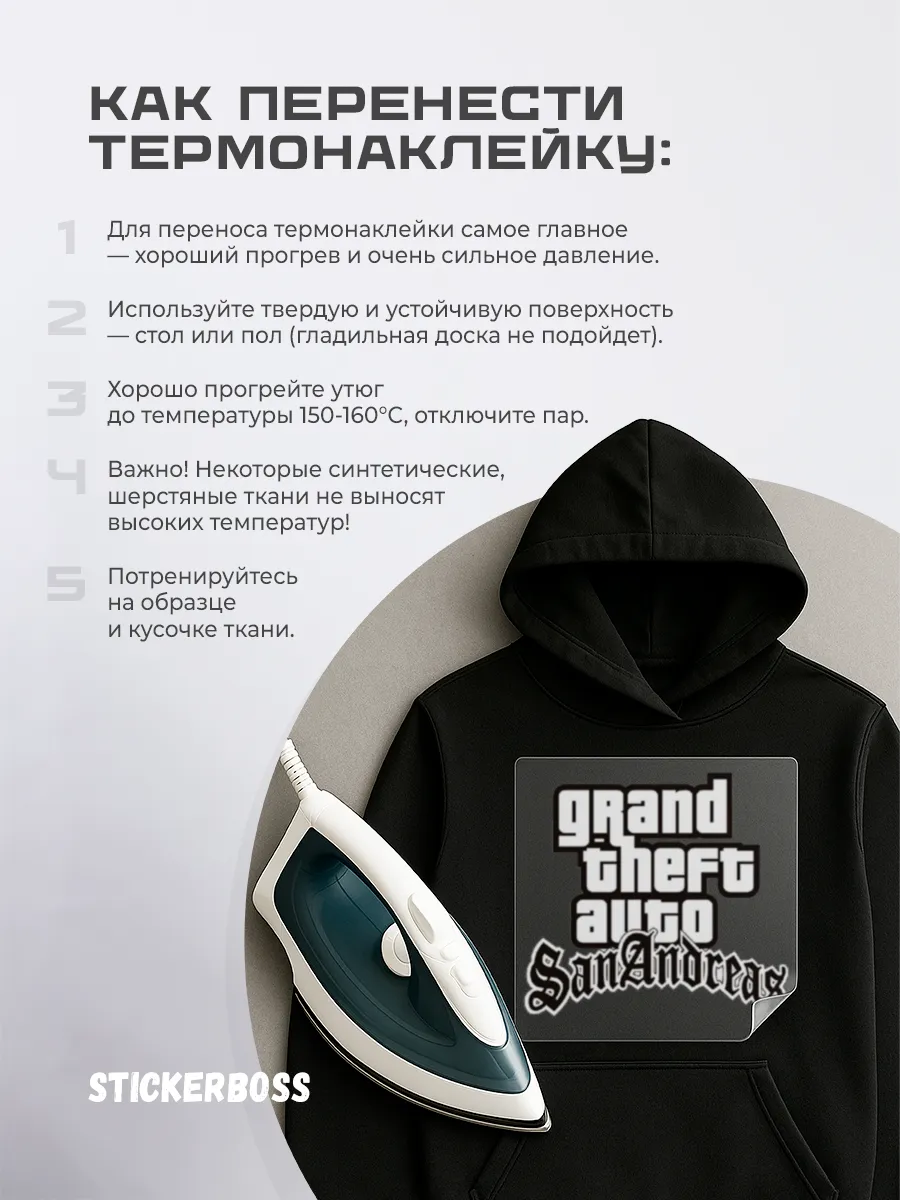 Перед нанесением разместите наклейку на выбранном участке ткани. Поместите ткань на гладкую поверхность, накройте наклейку тканью и прогладьте утюгом до закрепления клеевого слоя. Следуйте рекомендациям по нанесению и уходу, чтобы сохранить внешний вид изделия.