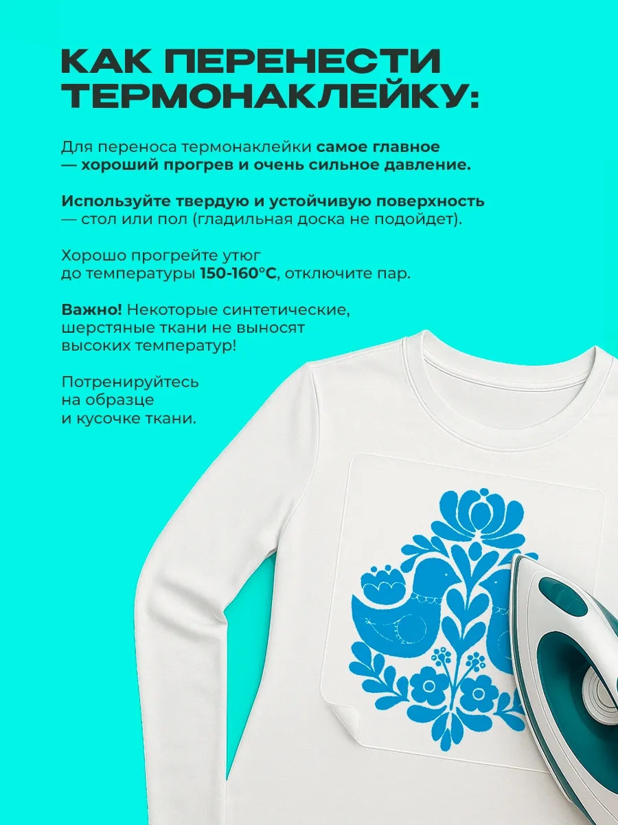 После нанесения соблюдайте обычные правила стирки и ухода за вещами, избегайте высоких температур на месте нанесения (согласно инструкции по уходу за наклейкой).