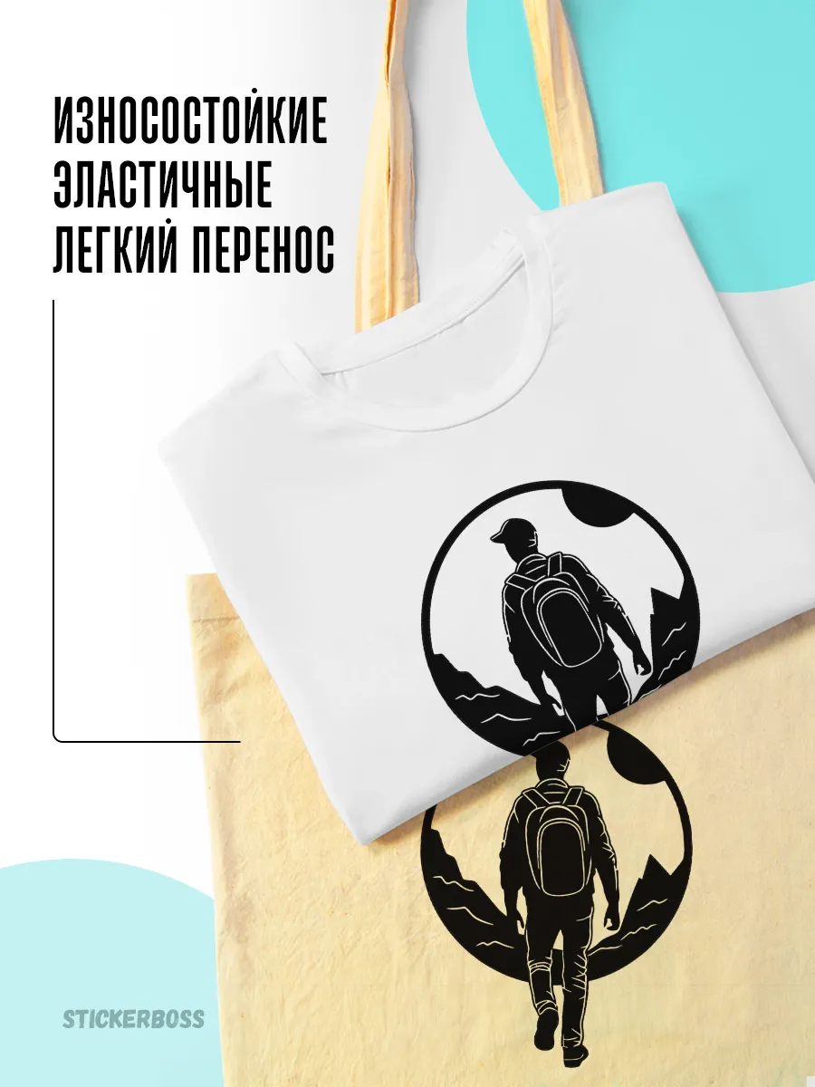 Подходит для футболок, курток, кепок, шопперов и других текстильных изделий. Наклейку размещайте на чистой поверхности ткани, разглаживайте по центру и проглаживайте утюгом через ткань.