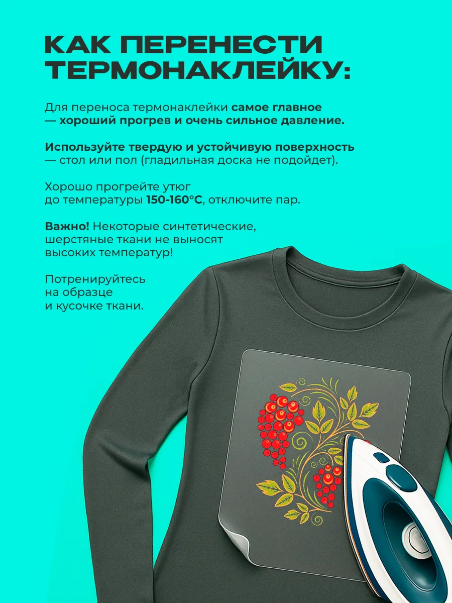 Преимущество термонаклейки на одежду — быстрый и надёжный способ изменить внешний вид гардероба. Термотрансфер наносится на ткань с использованием утюга, подложка клея обеспечивает крепкое сцепление, а сам клеевой слой активируется теплом.