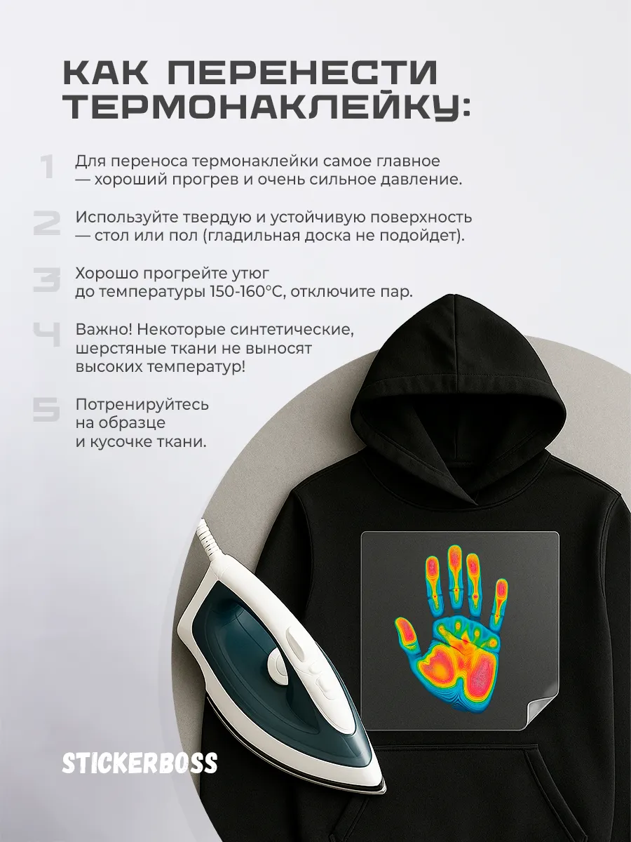 Термонаклейка на одежду Ладонь инфрокрасная 27 — удобный способ придать вещам индивидуальность и обновить гардероб. Благодаря термоклеевой подложке наклейка надежно фиксируется на ткани, сохраняет форму и цвет при носке и стирке. Этот набор доступен в черном цвете и выпускается в России.