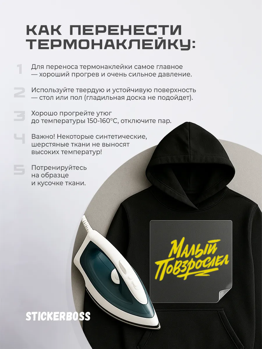 Наклейку можно нанести утюгом. Тепло активирует клеевой слой и обеспечивает прочное сцепление с тканью. Следуйте инструкциям производителя и дайте остыть после воздействия тепла для фиксации.