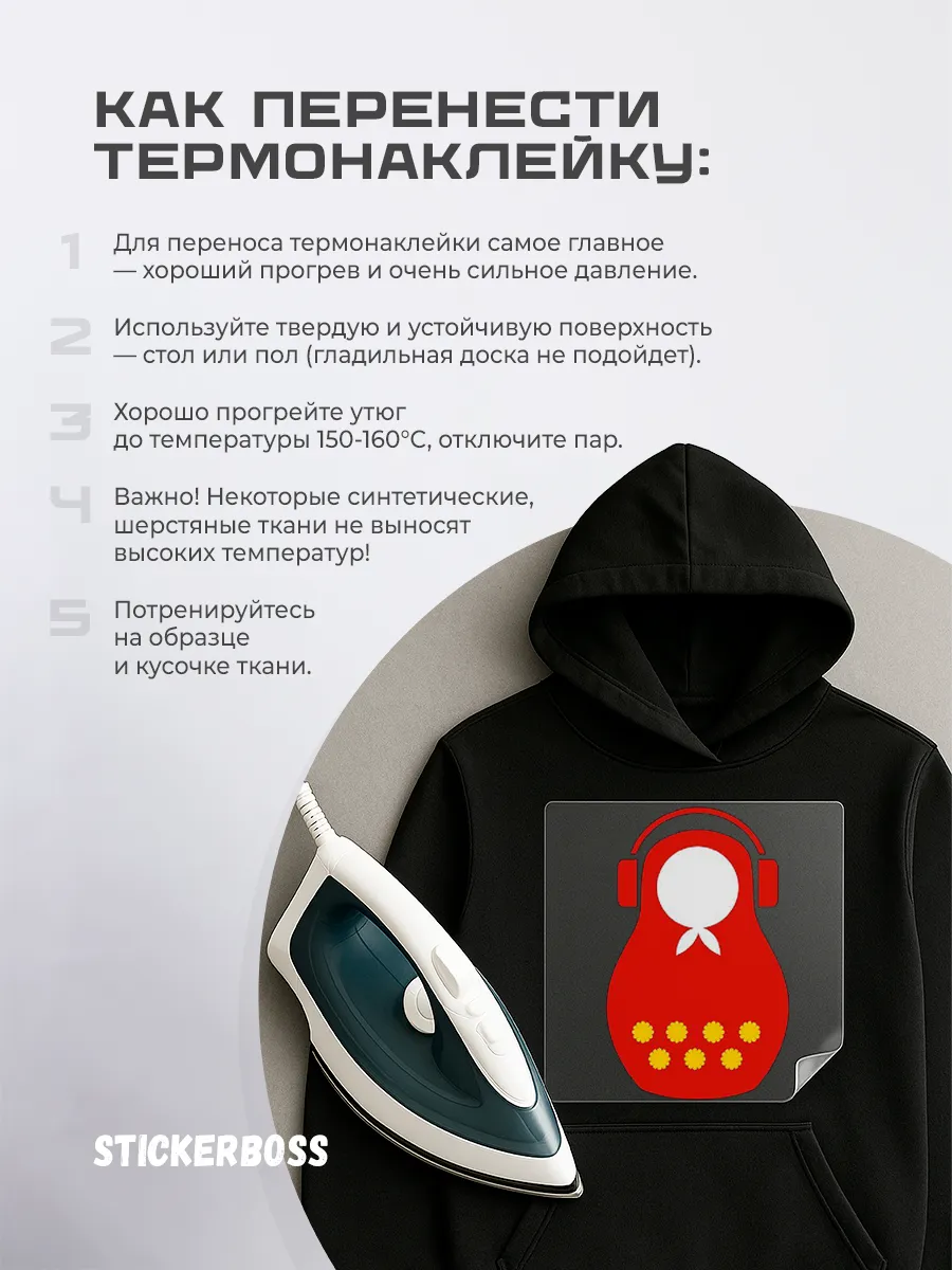 Термонаклейка термотрансфер на одежду Матрешка арт 83 представляет собой наклейку для ткани с термоклеевой подложкой. Такой декор быстро наносится утюгом и обеспечивает долговечное крепление к материалу. Дизайн Матрешка арт 83 добавляет оригинальности гардеробу и подходит для разнообразных образов.