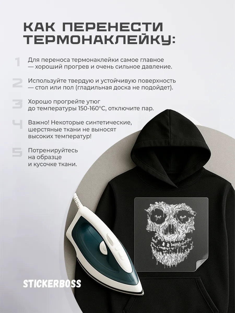 Наклейку наносят на чистую ткань при использовании утюга. Следите за температурой и не используйте пар, пока наклейка не закрепится.