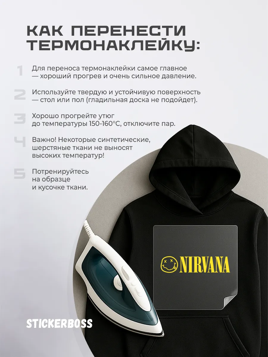 Термонаклейка термотрансфер на одежду Нирвана 142 представляет собой декоративную наклейку для ткани, которая обеспечивает легкое нанесение и долговременное сцепление с материалом. Она подходит для любителей индивидуального стиля и может служить альтернативой заплаткам, создавая стильный и модный образ.