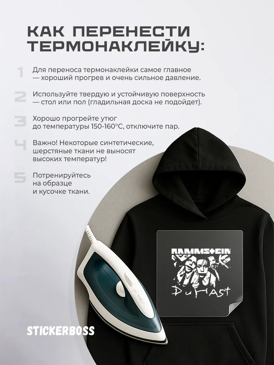Наклейку можно использовать для одежды — она наносится на ткань утюгом и застывает при охлаждении, образуя прочное декоративное покрытие на изделии. Дизайн Рамштайн 135 добавляет индивидуальности и оригинальности вашей одежде.