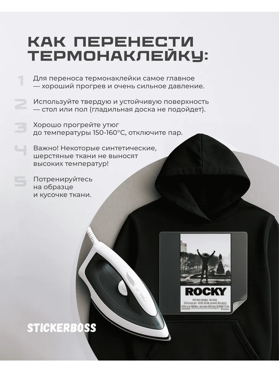 Разместите наклейку в нужном месте одежды, накройте тонким носителем — пергаментной бумагой или тканью — и равномерно проглаживайте горизонтальными движениями. Избегайте сильного перегрева и повторных прокладок по одному месту — это может повредить рисунок.