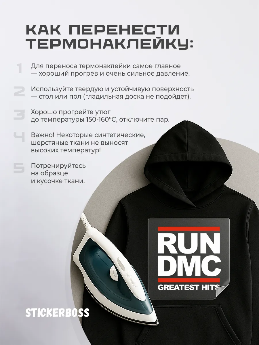 Эта термонаклейка термотрансфер на одежду Run D.M.C. 140 позволяет быстро изменить вид одежды и добавить уникальный стиль. Наклейка наносится утюгом на ткань, клеевой слой активируется теплом и обеспечивает прочное сцепление и долговечность. Наклейка отличается эластичностью и не выцветает после стирок, что делает ее удобной для повседневной носки.