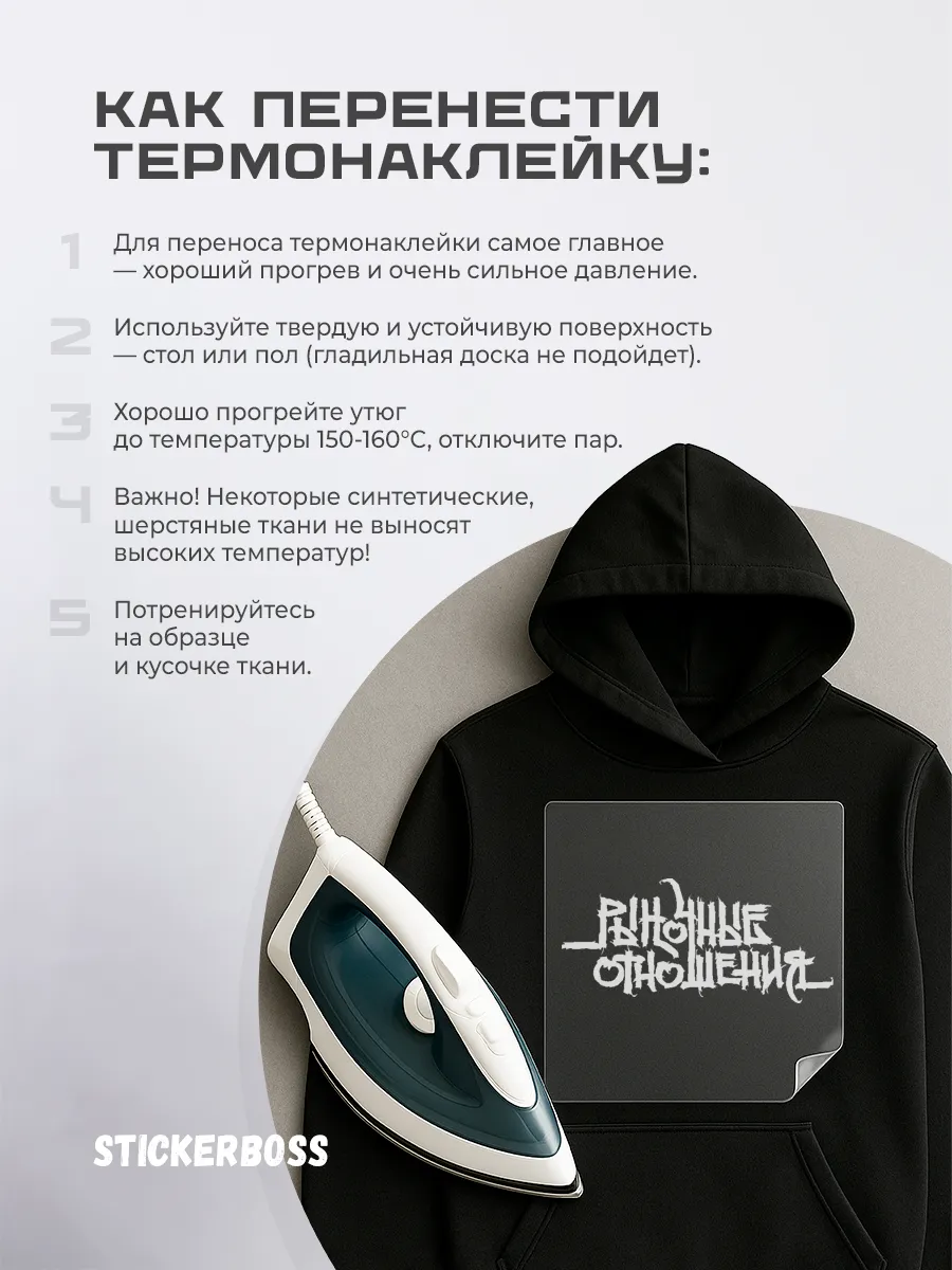 Разместите наклейку на чистой ткани. Затем равномерно прижмите утюгом через ткань, пока рисунок не закрепится. Дайте изделию остыть и убедитесь в прочности фиксации.