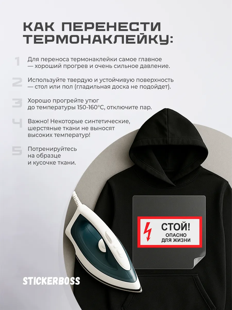 Расположите наклейку на ткани лицевой стороной вверх. Поместите ткань на утюг и проглаживайте через ткань в течение нескольких секунд до закрепления. Не тяните и не используйте слишком высокую температуру — следуйте инструкциям по нанесению на упаковке.