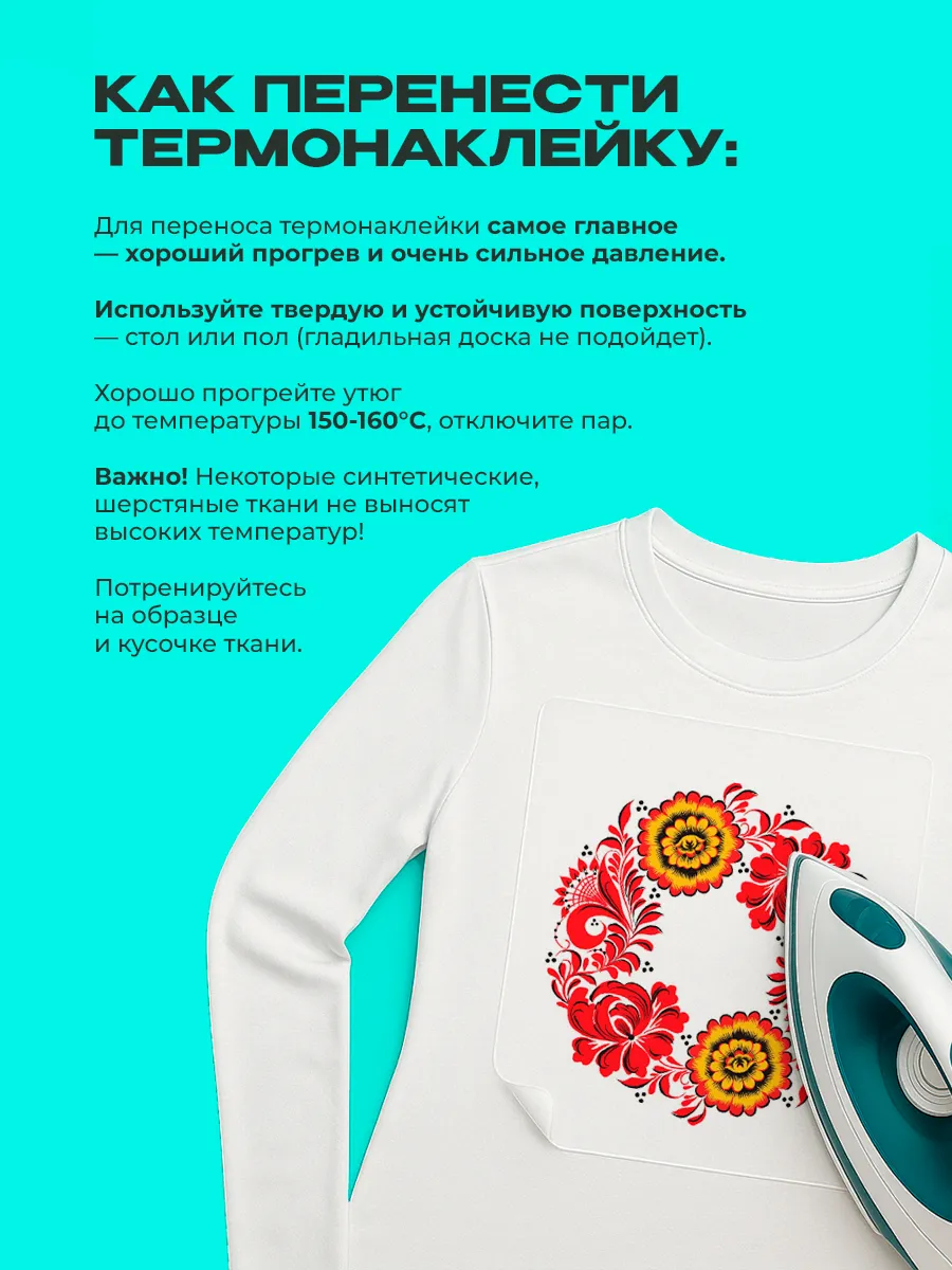 Наклейка фиксируется термической обработкой: тепло от утюга активирует клеевой слой и обеспечивает надежное сцепление с тканью. Подложка термоклейки повышает прочность нанесения.