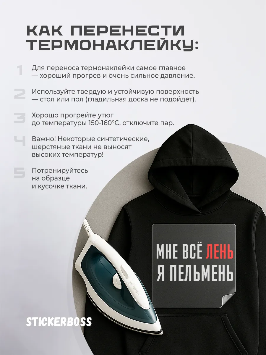 Уход за изделием следует общим рекомендациям по уходу за термотрансферной аппликацией. Уточняйте инструкции производителя для конкретной одежды.