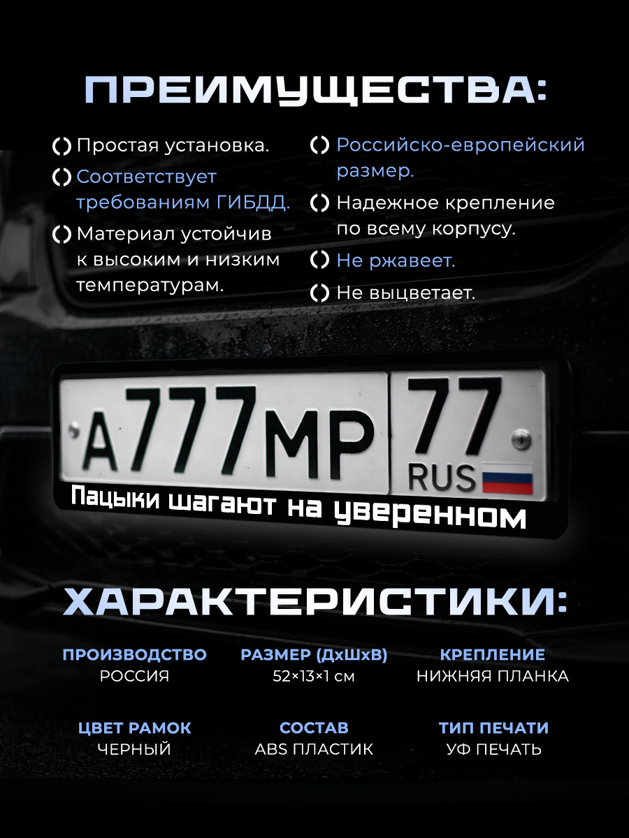 Рамка для ГОС номера автомобиля 52х13х1 см универсальная, выполнена из качественного и надежного ABS пластика. Она подойдет практически для любой марки автомобиля в том числе и для китайских. На лицевой стороне выполнена качественная печать методом УФ печати, которая устойчива к любым погодным условиям, не выгорает со временем и не выцветает.