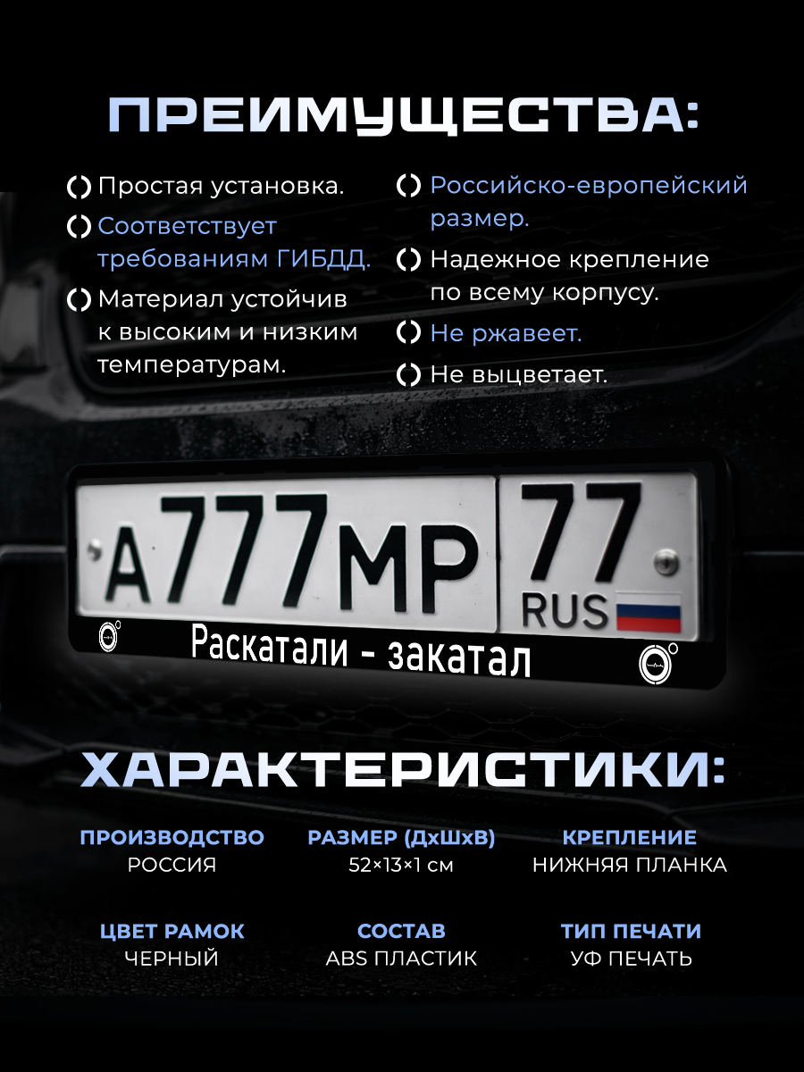 Рамка для ГОС номера автомобиля 52х13х1 см универсальная, выполнена из качественного и надежного ABS пластика. Она подойдет практически для любой марки автомобиля в том числе и для китайских. На лицевой стороне выполнена качественная печать методом УФ печати, которая устойчива к любым погодным условиям, не выгорает со временем и не выцветает.