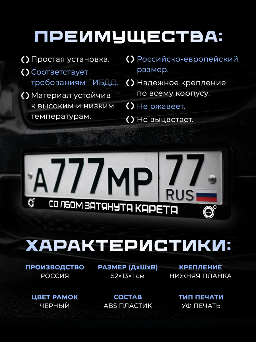 Рамка для ГОС номера автомобиля 52х13х1 см универсальная, выполнена из качественного и надежного ABS пластика. Она подойдет практически для любой марки автомобиля в том числе и для китайских. На лицевой стороне выполнена качественная печать методом УФ печати, которая устойчива к любым погодным условиям, не выгорает со временем и не выцветает.