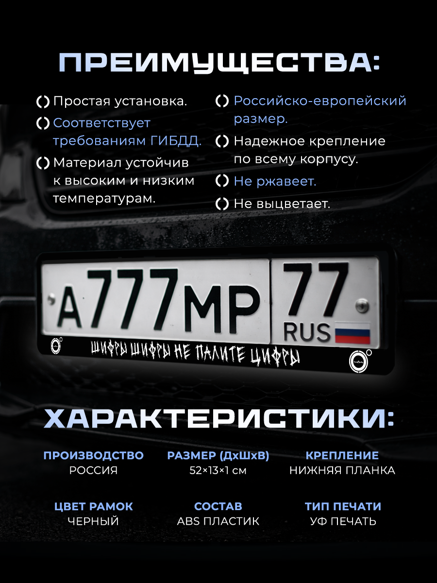 Рамка для ГОС номера автомобиля 52х13х1 см универсальная, выполнена из качественного и надежного ABS пластика. Она подойдет практически для любой марки автомобиля в том числе и для китайских. На лицевой стороне выполнена качественная печать методом УФ печати, которая устойчива к любым погодным условиям, не выгорает со временем и не выцветает.
