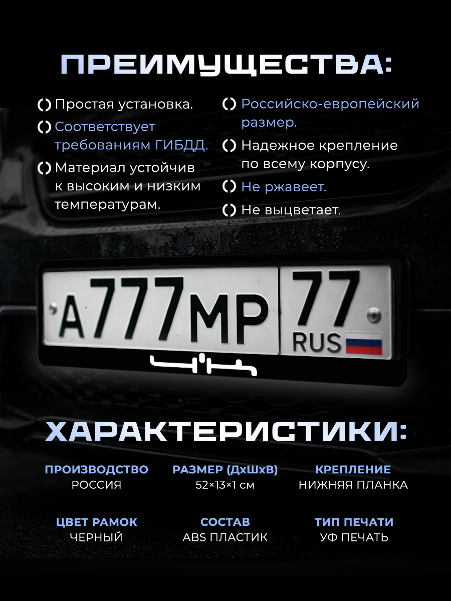 Рамка для ГОС номера автомобиля 52х13х1 см универсальная, выполнена из качественного и надежного ABS пластика. Она подойдет практически для любой марки автомобиля в том числе и для китайских. На лицевой стороне выполнена качественная печать методом УФ печати, которая устойчива к любым погодным условиям, не выгорает со временем и не выцветает.