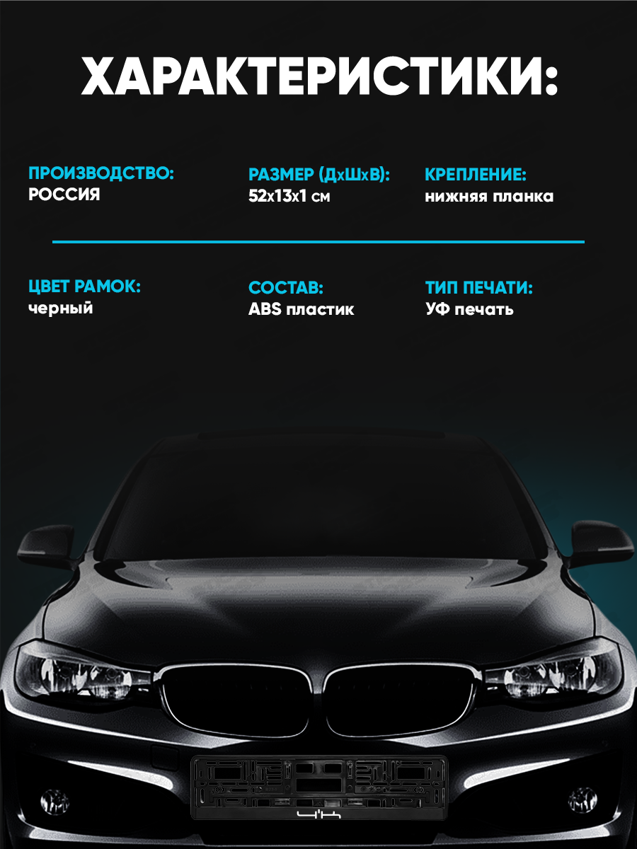 Рамка для ГОС номера автомобиля 52х13х1 см универсальная, выполнена из качественного и надежного ABS пластика. Она подойдет практически для любой марки автомобиля. На лицевой стороне выполнена качественная печать методом УФ печати, которая устойчива к любым погодным условиям, не выгорает со временем и не выцветает. Принты и надписи выполнены в лучших традициях Бренда Stickerboss, что способствует привлечению все большего количества восторженных взглядов к вашему авто. Наши рамки для машины будут выполнять не только свою основную функцию по креплению номерного знака, но и добавит стиля вашей машине. Ее легко установить: крепление надежное, плотно прилегает к бамперу и прослужит Вам длительное время. Такой автотовар - отличная идея для подарка другу! Автомобильному аксессуару не страшны дождь, снег и перепады температур. Конструкция изделия соответствует требованиям ГИБДД, имеет Российско-европейский размер. Вы можете выбрать любую из рамок с надписью на свой вкус, перейдя в каталог магазина Stickerboss! Также от нашего бренда можно приобрести разные товары для авто.