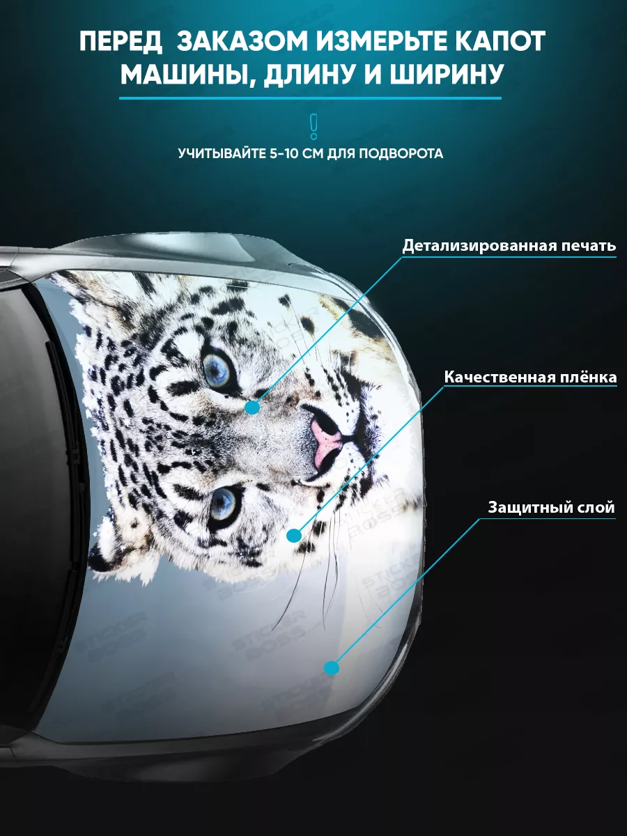 Предлагаем вашему вниманию большую декоративную наклейку на капот вашего авто. Размер стикера универсальный - 155х119 см, подойдет на капоты большинства популярных авто, будь то седан, хэтчбек или универсал. При необходимости можно подрезать лист под нужный размер. При изготовлении этих автонаклеек мы используем высококачественную самоклеящуюся виниловую пленку ПВХ, которая обеспечивает надежное приклеивание к поверхности, устойчива к любому виду моек и агрессивным погодным условиям, не боится пыли и влаги, не выгорает на солнце благодаря дополнительному верхнему слою ламинации. При желании, легко снимается, не оставляя следов. В наличии множество различных вариантов на любой вкус – в коллекции есть принты с надписями, героями известных кинофильмов, динамичные изображения львов, тигров, волков, медведей, леопардов, собак, лошадей, и прочих животных, принты в стиле аниме, флаги России, флаги известных футбольных клубов, горы, города, живописные пейзажи и многое другое. Наклейка позволяет украсить автомобиль и добавить ему стиля и индивидуальности, декорировать под ваши индивидуальные взгляды на дизайн машины. Товар упаковывается в специальную защитную тубу, что позволяет обеспечить его сохранность во время доставки и порадовать наших покупателей яркими красками и высоким качеством наших стикеров. Они так же станут отличным подарком вашим близким на новый год, день рождения, женщинам на 8 марта и мужчинам на 23 февраля. Сделайте повседневную езду на машине ярче, вместе с продукцией бренда Stickerboss!