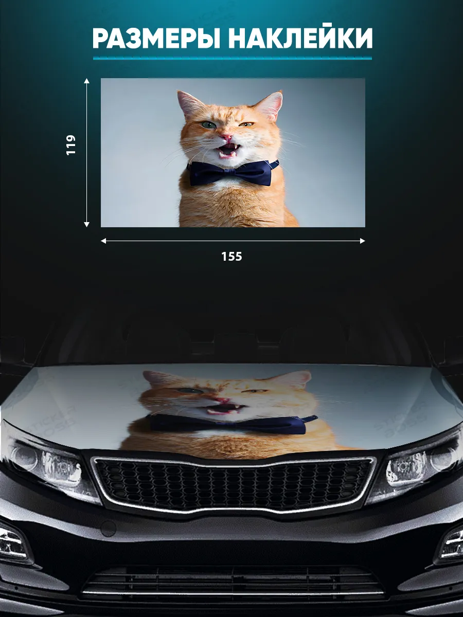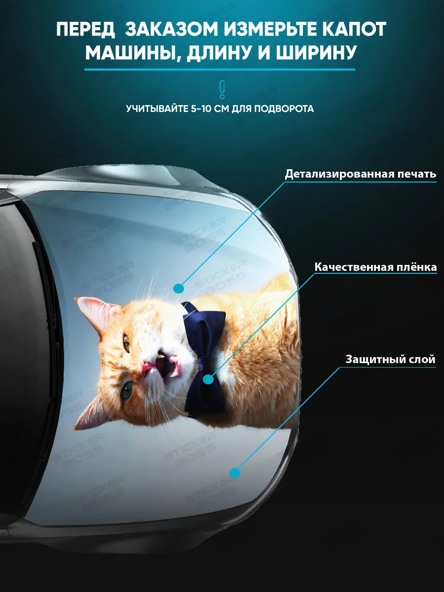 Предлагаем вашему вниманию большую декоративную наклейку на капот вашего авто. Размер стикера универсальный - 155х119 см, подойдет на капоты большинства популярных авто, будь то седан, хэтчбек или универсал. При необходимости можно подрезать лист под нужный размер. При изготовлении этих автонаклеек мы используем высококачественную самоклеящуюся виниловую пленку ПВХ, которая обеспечивает надежное приклеивание к поверхности, устойчива к любому виду моек и агрессивным погодным условиям, не боится пыли и влаги, не выгорает на солнце благодаря дополнительному верхнему слою ламинации. При желании, легко снимается, не оставляя следов. В наличии множество различных вариантов на любой вкус – в коллекции есть принты с надписями, героями известных кинофильмов, динамичные изображения львов, тигров, волков, медведей, леопардов, собак, лошадей, и прочих животных, принты в стиле аниме, флаги России, флаги известных футбольных клубов, горы, города, живописные пейзажи и многое другое. Наклейка позволяет украсить автомобиль и добавить ему стиля и индивидуальности, декорировать под ваши индивидуальные взгляды на дизайн машины. Товар упаковывается в специальную защитную тубу, что позволяет обеспечить его сохранность во время доставки и порадовать наших покупателей яркими красками и высоким качеством наших стикеров. Они так же станут отличным подарком вашим близким на новый год, день рождения, женщинам на 8 марта и мужчинам на 23 февраля. Сделайте повседневную езду на машине ярче, вместе с продукцией бренда Stickerboss!