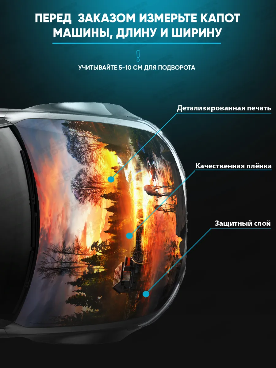 Предлагаем вашему вниманию большую декоративную наклейку на капот вашего авто. Размер стикера универсальный - 155х119 см, подойдет на капоты большинства популярных авто, будь то седан, хэтчбек или универсал. При необходимости можно подрезать лист под нужный размер. При изготовлении этих автонаклеек мы используем высококачественную самоклеящуюся виниловую пленку ПВХ, которая обеспечивает надежное приклеивание к поверхности, устойчива к любому виду моек и агрессивным погодным условиям, не боится пыли и влаги, не выгорает на солнце благодаря дополнительному верхнему слою ламинации. При желании, легко снимается, не оставляя следов. В наличии множество различных вариантов на любой вкус – в коллекции есть принты с надписями, героями известных кинофильмов, динамичные изображения львов, тигров, волков, медведей, леопардов, собак, лошадей, и прочих животных, принты в стиле аниме, флаги России, флаги известных футбольных клубов, горы, города, живописные пейзажи и многое другое. Наклейка позволяет украсить автомобиль и добавить ему стиля и индивидуальности, декорировать под ваши индивидуальные взгляды на дизайн машины. Товар упаковывается в специальную защитную тубу, что позволяет обеспечить его сохранность во время доставки и порадовать наших покупателей яркими красками и высоким качеством наших стикеров. Они так же станут отличным подарком вашим близким на новый год, день рождения, женщинам на 8 марта и мужчинам на 23 февраля. Сделайте повседневную езду на машине ярче, вместе с продукцией бренда Stickerboss!