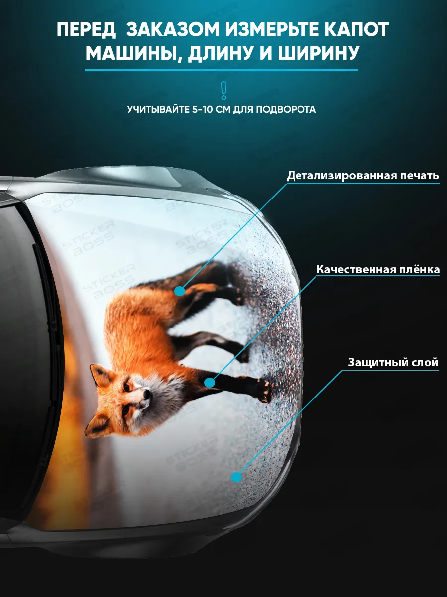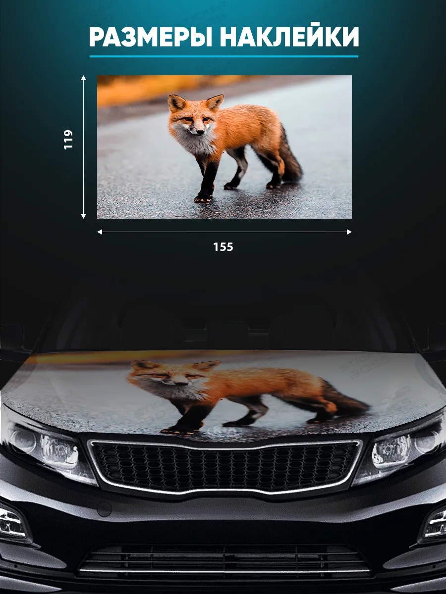 Предлагаем вашему вниманию большую декоративную наклейку на капот вашего авто. Размер стикера универсальный - 155х119 см, подойдет на капоты большинства популярных авто, будь то седан, хэтчбек или универсал. При необходимости можно подрезать лист под нужный размер. При изготовлении этих автонаклеек мы используем высококачественную самоклеящуюся виниловую пленку ПВХ, которая обеспечивает надежное приклеивание к поверхности, устойчива к любому виду моек и агрессивным погодным условиям, не боится пыли и влаги, не выгорает на солнце благодаря дополнительному верхнему слою ламинации. При желании, легко снимается, не оставляя следов. В наличии множество различных вариантов на любой вкус – в коллекции есть принты с надписями, героями известных кинофильмов, динамичные изображения львов, тигров, волков, медведей, леопардов, собак, лошадей, и прочих животных, принты в стиле аниме, флаги России, флаги известных футбольных клубов, горы, города, живописные пейзажи и многое другое. Наклейка позволяет украсить автомобиль и добавить ему стиля и индивидуальности, декорировать под ваши индивидуальные взгляды на дизайн машины. Товар упаковывается в специальную защитную тубу, что позволяет обеспечить его сохранность во время доставки и порадовать наших покупателей яркими красками и высоким качеством наших стикеров. Они так же станут отличным подарком вашим близким на новый год, день рождения, женщинам на 8 марта и мужчинам на 23 февраля. Сделайте повседневную езду на машине ярче, вместе с продукцией бренда Stickerboss!