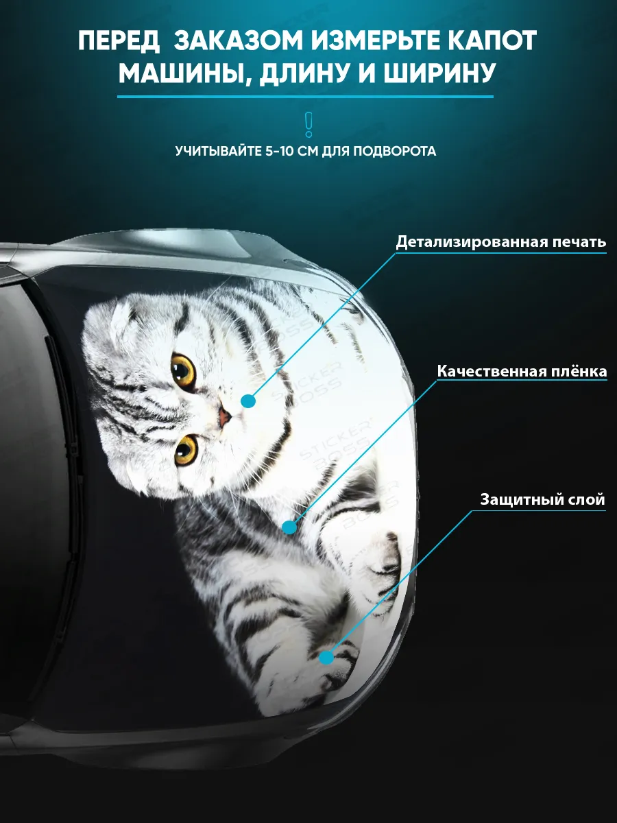 Предлагаем вашему вниманию большую декоративную наклейку на капот вашего авто. Размер стикера универсальный - 155х119 см, подойдет на капоты большинства популярных авто, будь то седан, хэтчбек или универсал. При необходимости можно подрезать лист под нужный размер. При изготовлении этих автонаклеек мы используем высококачественную самоклеящуюся виниловую пленку ПВХ, которая обеспечивает надежное приклеивание к поверхности, устойчива к любому виду моек и агрессивным погодным условиям, не боится пыли и влаги, не выгорает на солнце благодаря дополнительному верхнему слою ламинации. При желании, легко снимается, не оставляя следов. В наличии множество различных вариантов на любой вкус – в коллекции есть принты с надписями, героями известных кинофильмов, динамичные изображения львов, тигров, волков, медведей, леопардов, собак, лошадей, и прочих животных, принты в стиле аниме, флаги России, флаги известных футбольных клубов, горы, города, живописные пейзажи и многое другое. Наклейка позволяет украсить автомобиль и добавить ему стиля и индивидуальности, декорировать под ваши индивидуальные взгляды на дизайн машины. Товар упаковывается в специальную защитную тубу, что позволяет обеспечить его сохранность во время доставки и порадовать наших покупателей яркими красками и высоким качеством наших стикеров. Они так же станут отличным подарком вашим близким на новый год, день рождения, женщинам на 8 марта и мужчинам на 23 февраля. Сделайте повседневную езду на машине ярче, вместе с продукцией бренда Stickerboss!