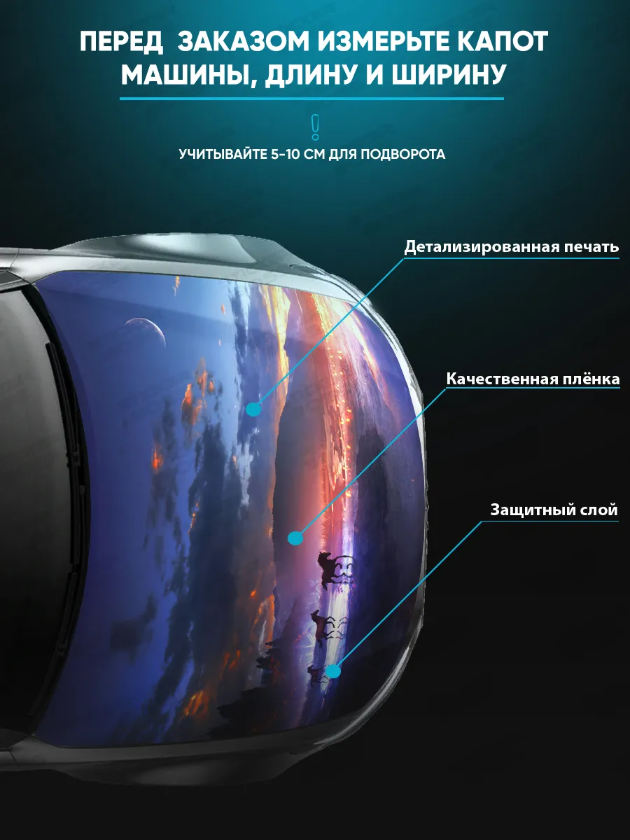 Предлагаем вашему вниманию большую декоративную наклейку на капот вашего авто. Размер стикера универсальный - 155х119 см, подойдет на капоты большинства популярных авто, будь то седан, хэтчбек или универсал. При необходимости можно подрезать лист под нужный размер. При изготовлении этих автонаклеек мы используем высококачественную самоклеящуюся виниловую пленку ПВХ, которая обеспечивает надежное приклеивание к поверхности, устойчива к любому виду моек и агрессивным погодным условиям, не боится пыли и влаги, не выгорает на солнце благодаря дополнительному верхнему слою ламинации. При желании, легко снимается, не оставляя следов. В наличии множество различных вариантов на любой вкус – в коллекции есть принты с надписями, героями известных кинофильмов, динамичные изображения львов, тигров, волков, медведей, леопардов, собак, лошадей, и прочих животных, принты в стиле аниме, флаги России, флаги известных футбольных клубов, горы, города, живописные пейзажи и многое другое. Наклейка позволяет украсить автомобиль и добавить ему стиля и индивидуальности, декорировать под ваши индивидуальные взгляды на дизайн машины. Товар упаковывается в специальную защитную тубу, что позволяет обеспечить его сохранность во время доставки и порадовать наших покупателей яркими красками и высоким качеством наших стикеров. Они так же станут отличным подарком вашим близким на новый год, день рождения, женщинам на 8 марта и мужчинам на 23 февраля. Сделайте повседневную езду на машине ярче, вместе с продукцией бренда Stickerboss!