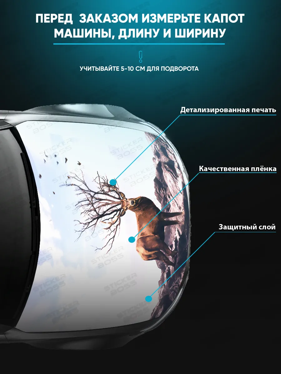 Предлагаем вашему вниманию большую декоративную наклейку на капот вашего авто. Размер стикера универсальный - 155х119 см, подойдет на капоты большинства популярных авто, будь то седан, хэтчбек или универсал. При необходимости можно подрезать лист под нужный размер. При изготовлении этих автонаклеек мы используем высококачественную самоклеящуюся виниловую пленку ПВХ, которая обеспечивает надежное приклеивание к поверхности, устойчива к любому виду моек и агрессивным погодным условиям, не боится пыли и влаги, не выгорает на солнце благодаря дополнительному верхнему слою ламинации. При желании, легко снимается, не оставляя следов. В наличии множество различных вариантов на любой вкус – в коллекции есть принты с надписями, героями известных кинофильмов, динамичные изображения львов, тигров, волков, медведей, леопардов, собак, лошадей, и прочих животных, принты в стиле аниме, флаги России, флаги известных футбольных клубов, горы, города, живописные пейзажи и многое другое. Наклейка позволяет украсить автомобиль и добавить ему стиля и индивидуальности, декорировать под ваши индивидуальные взгляды на дизайн машины. Товар упаковывается в специальную защитную тубу, что позволяет обеспечить его сохранность во время доставки и порадовать наших покупателей яркими красками и высоким качеством наших стикеров. Они так же станут отличным подарком вашим близким на новый год, день рождения, женщинам на 8 марта и мужчинам на 23 февраля. Сделайте повседневную езду на машине ярче, вместе с продукцией бренда Stickerboss!