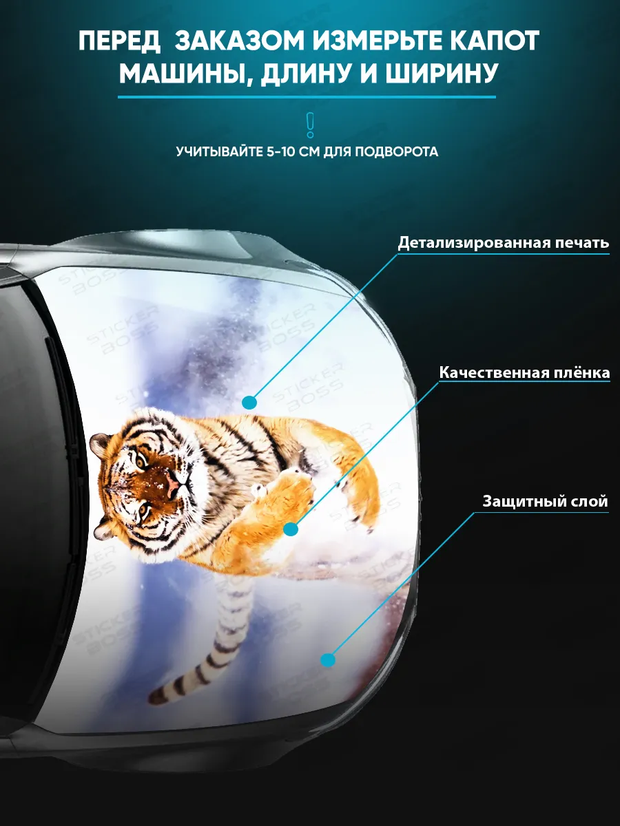 Предлагаем вашему вниманию большую декоративную наклейку на капот вашего авто. Размер стикера универсальный - 155х119 см, подойдет на капоты большинства популярных авто, будь то седан, хэтчбек или универсал. При необходимости можно подрезать лист под нужный размер. При изготовлении этих автонаклеек мы используем высококачественную самоклеящуюся виниловую пленку ПВХ, которая обеспечивает надежное приклеивание к поверхности, устойчива к любому виду моек и агрессивным погодным условиям, не боится пыли и влаги, не выгорает на солнце благодаря дополнительному верхнему слою ламинации. При желании, легко снимается, не оставляя следов. В наличии множество различных вариантов на любой вкус – в коллекции есть принты с надписями, героями известных кинофильмов, динамичные изображения львов, тигров, волков, медведей, леопардов, собак, лошадей, и прочих животных, принты в стиле аниме, флаги России, флаги известных футбольных клубов, горы, города, живописные пейзажи и многое другое. Наклейка позволяет украсить автомобиль и добавить ему стиля и индивидуальности, декорировать под ваши индивидуальные взгляды на дизайн машины. Товар упаковывается в специальную защитную тубу, что позволяет обеспечить его сохранность во время доставки и порадовать наших покупателей яркими красками и высоким качеством наших стикеров. Они так же станут отличным подарком вашим близким на новый год, день рождения, женщинам на 8 марта и мужчинам на 23 февраля. Сделайте повседневную езду на машине ярче, вместе с продукцией бренда Stickerboss!
