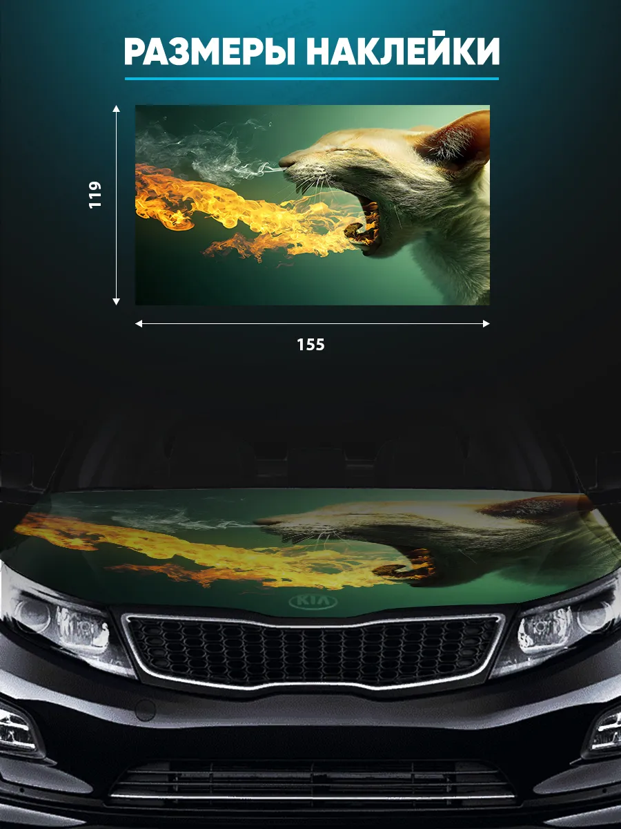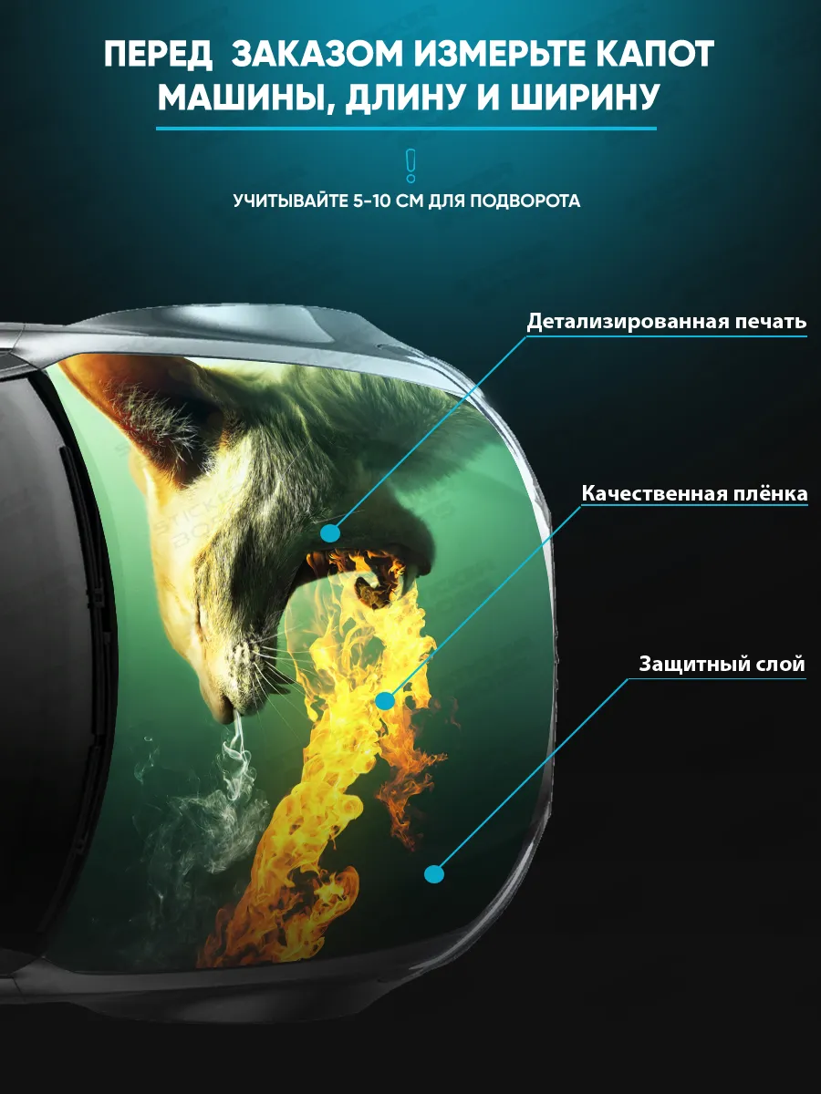Предлагаем вашему вниманию большую декоративную наклейку на капот вашего авто. Размер стикера универсальный - 155х119 см, подойдет на капоты большинства популярных авто, будь то седан, хэтчбек или универсал. При необходимости можно подрезать лист под нужный размер. При изготовлении этих автонаклеек мы используем высококачественную самоклеящуюся виниловую пленку ПВХ, которая обеспечивает надежное приклеивание к поверхности, устойчива к любому виду моек и агрессивным погодным условиям, не боится пыли и влаги, не выгорает на солнце благодаря дополнительному верхнему слою ламинации. При желании, легко снимается, не оставляя следов. В наличии множество различных вариантов на любой вкус – в коллекции есть принты с надписями, героями известных кинофильмов, динамичные изображения львов, тигров, волков, медведей, леопардов, собак, лошадей, и прочих животных, принты в стиле аниме, флаги России, флаги известных футбольных клубов, горы, города, живописные пейзажи и многое другое. Наклейка позволяет украсить автомобиль и добавить ему стиля и индивидуальности, декорировать под ваши индивидуальные взгляды на дизайн машины. Товар упаковывается в специальную защитную тубу, что позволяет обеспечить его сохранность во время доставки и порадовать наших покупателей яркими красками и высоким качеством наших стикеров. Они так же станут отличным подарком вашим близким на новый год, день рождения, женщинам на 8 марта и мужчинам на 23 февраля. Сделайте повседневную езду на машине ярче, вместе с продукцией бренда Stickerboss!