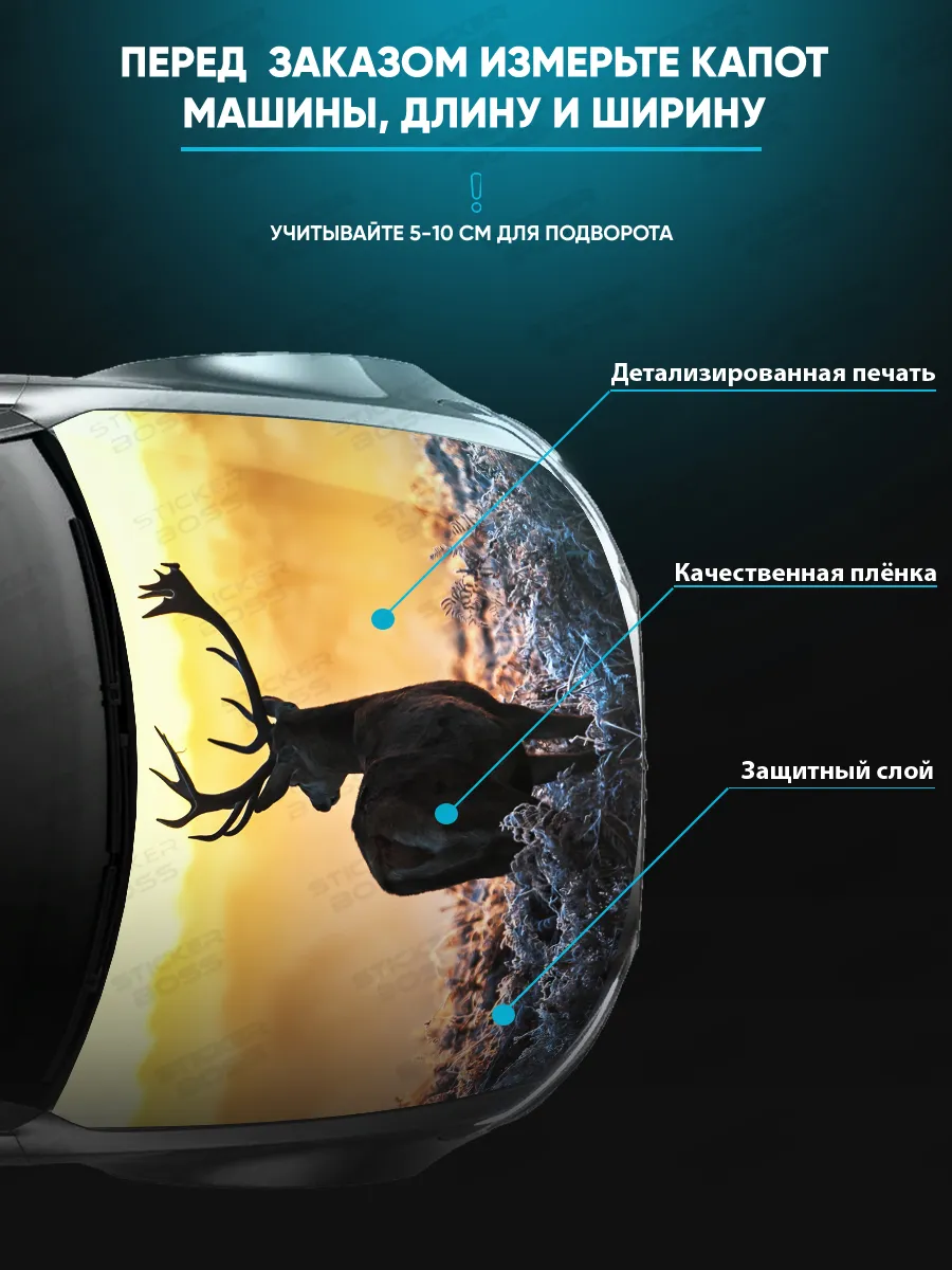 Предлагаем вашему вниманию большую декоративную наклейку на капот вашего авто. Размер стикера универсальный - 155х119 см, подойдет на капоты большинства популярных авто, будь то седан, хэтчбек или универсал. При необходимости можно подрезать лист под нужный размер. При изготовлении этих автонаклеек мы используем высококачественную самоклеящуюся виниловую пленку ПВХ, которая обеспечивает надежное приклеивание к поверхности, устойчива к любому виду моек и агрессивным погодным условиям, не боится пыли и влаги, не выгорает на солнце благодаря дополнительному верхнему слою ламинации. При желании, легко снимается, не оставляя следов. В наличии множество различных вариантов на любой вкус – в коллекции есть принты с надписями, героями известных кинофильмов, динамичные изображения львов, тигров, волков, медведей, леопардов, собак, лошадей, и прочих животных, принты в стиле аниме, флаги России, флаги известных футбольных клубов, горы, города, живописные пейзажи и многое другое. Наклейка позволяет украсить автомобиль и добавить ему стиля и индивидуальности, декорировать под ваши индивидуальные взгляды на дизайн машины. Товар упаковывается в специальную защитную тубу, что позволяет обеспечить его сохранность во время доставки и порадовать наших покупателей яркими красками и высоким качеством наших стикеров. Они так же станут отличным подарком вашим близким на новый год, день рождения, женщинам на 8 марта и мужчинам на 23 февраля. Сделайте повседневную езду на машине ярче, вместе с продукцией бренда Stickerboss!