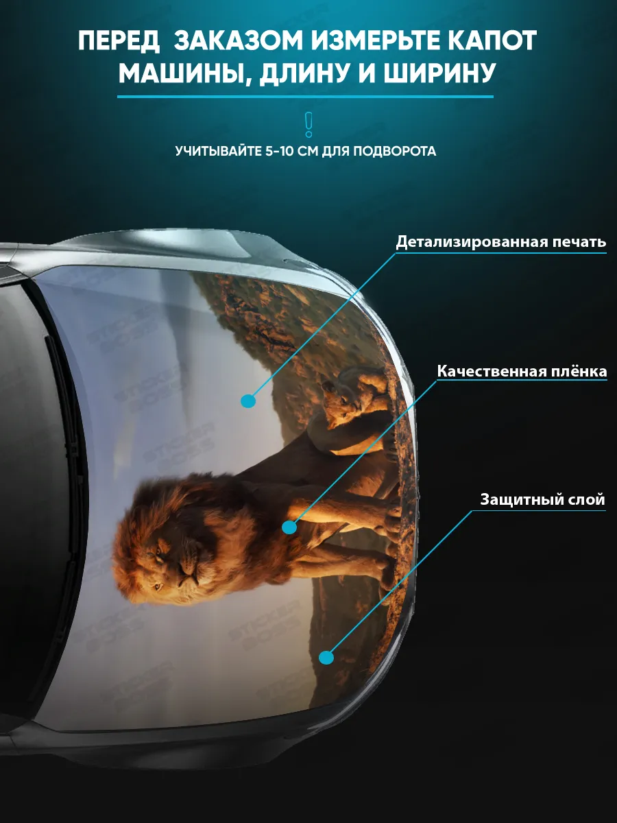 Предлагаем вашему вниманию большую декоративную наклейку на капот вашего авто. Размер стикера универсальный - 155х119 см, подойдет на капоты большинства популярных авто, будь то седан, хэтчбек или универсал. При необходимости можно подрезать лист под нужный размер. При изготовлении этих автонаклеек мы используем высококачественную самоклеящуюся виниловую пленку ПВХ, которая обеспечивает надежное приклеивание к поверхности, устойчива к любому виду моек и агрессивным погодным условиям, не боится пыли и влаги, не выгорает на солнце благодаря дополнительному верхнему слою ламинации. При желании, легко снимается, не оставляя следов. В наличии множество различных вариантов на любой вкус – в коллекции есть принты с надписями, героями известных кинофильмов, динамичные изображения львов, тигров, волков, медведей, леопардов, собак, лошадей, и прочих животных, принты в стиле аниме, флаги России, флаги известных футбольных клубов, горы, города, живописные пейзажи и многое другое. Наклейка позволяет украсить автомобиль и добавить ему стиля и индивидуальности, декорировать под ваши индивидуальные взгляды на дизайн машины. Товар упаковывается в специальную защитную тубу, что позволяет обеспечить его сохранность во время доставки и порадовать наших покупателей яркими красками и высоким качеством наших стикеров. Они так же станут отличным подарком вашим близким на новый год, день рождения, женщинам на 8 марта и мужчинам на 23 февраля. Сделайте повседневную езду на машине ярче, вместе с продукцией бренда Stickerboss!