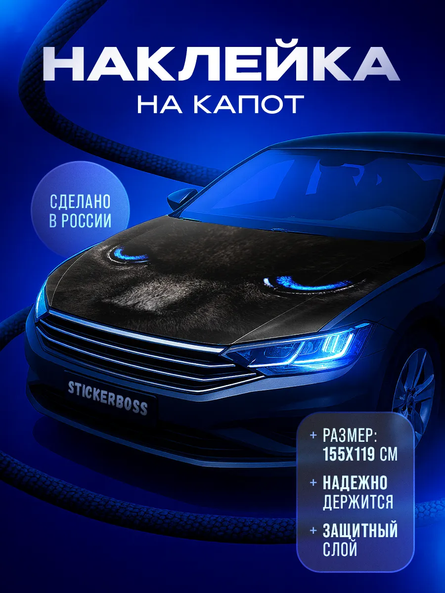 Предлагаем вашему вниманию большую декоративную наклейку на капот вашего авто. Размер стикера универсальный - 155х119 см, подойдет на капоты большинства популярных авто, будь то седан, хэтчбек или универсал. При необходимости можно подрезать лист под нужный размер. При изготовлении этих автонаклеек мы используем высококачественную самоклеящуюся виниловую пленку ПВХ, которая обеспечивает надежное приклеивание к поверхности, устойчива к любому виду моек и агрессивным погодным условиям, не боится пыли и влаги, не выгорает на солнце благодаря дополнительному верхнему слою ламинации. При желании, легко снимается, не оставляя следов. В наличии множество различных вариантов на любой вкус – в коллекции есть принты с надписями, героями известных кинофильмов, динамичные изображения львов, тигров, волков, медведей, леопардов, собак, лошадей, и прочих животных, принты в стиле аниме, флаги России, флаги известных футбольных клубов, горы, города, живописные пейзажи и многое другое. Наклейка позволяет украсить автомобиль и добавить ему стиля и индивидуальности, декорировать под ваши индивидуальные взгляды на дизайн машины. Товар упаковывается в специальную защитную тубу, что позволяет обеспечить его сохранность во время доставки и порадовать наших покупателей яркими красками и высоким качеством наших стикеров. Они так же станут отличным подарком вашим близким на новый год, день рождения, женщинам на 8 марта и мужчинам на 23 февраля. Сделайте повседневную езду на машине ярче, вместе с продукцией бренда Stickerboss!
