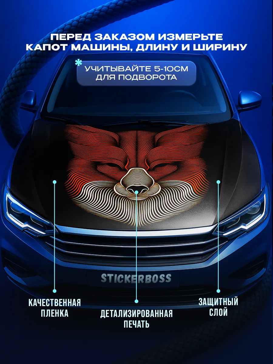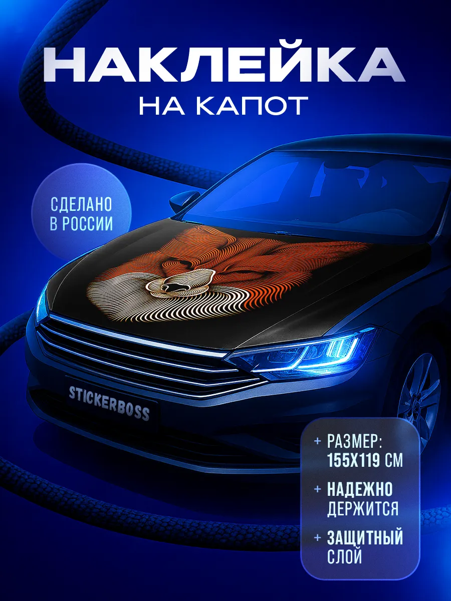 Предлагаем вашему вниманию большую декоративную наклейку на капот вашего авто. Размер стикера универсальный - 155х119 см, подойдет на капоты большинства популярных авто, будь то седан, хэтчбек или универсал. При необходимости можно подрезать лист под нужный размер. При изготовлении этих автонаклеек мы используем высококачественную самоклеящуюся виниловую пленку ПВХ, которая обеспечивает надежное приклеивание к поверхности, устойчива к любому виду моек и агрессивным погодным условиям, не боится пыли и влаги, не выгорает на солнце благодаря дополнительному верхнему слою ламинации. При желании, легко снимается, не оставляя следов. В наличии множество различных вариантов на любой вкус – в коллекции есть принты с надписями, героями известных кинофильмов, динамичные изображения львов, тигров, волков, медведей, леопардов, собак, лошадей, и прочих животных, принты в стиле аниме, флаги России, флаги известных футбольных клубов, горы, города, живописные пейзажи и многое другое. Наклейка позволяет украсить автомобиль и добавить ему стиля и индивидуальности, декорировать под ваши индивидуальные взгляды на дизайн машины. Товар упаковывается в специальную защитную тубу, что позволяет обеспечить его сохранность во время доставки и порадовать наших покупателей яркими красками и высоким качеством наших стикеров. Они так же станут отличным подарком вашим близким на новый год, день рождения, женщинам на 8 марта и мужчинам на 23 февраля. Сделайте повседневную езду на машине ярче, вместе с продукцией бренда Stickerboss!