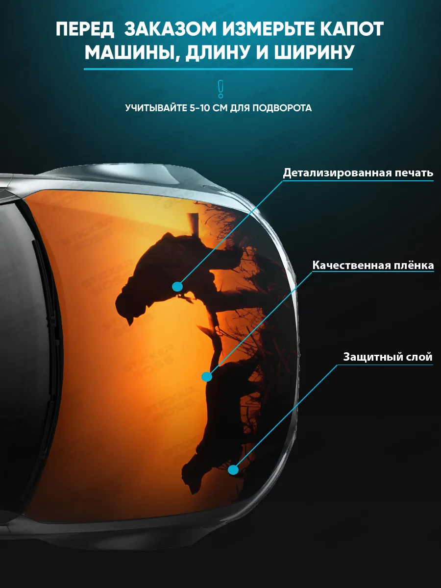 Предлагаем вашему вниманию большую декоративную наклейку на капот вашего авто. Размер стикера универсальный - 155х119 см, подойдет на капоты большинства популярных авто, будь то седан, хэтчбек или универсал. При необходимости можно подрезать лист под нужный размер. При изготовлении этих автонаклеек мы используем высококачественную самоклеящуюся виниловую пленку ПВХ, которая обеспечивает надежное приклеивание к поверхности, устойчива к любому виду моек и агрессивным погодным условиям, не боится пыли и влаги, не выгорает на солнце благодаря дополнительному верхнему слою ламинации. При желании, легко снимается, не оставляя следов. В наличии множество различных вариантов на любой вкус – в коллекции есть принты с надписями, героями известных кинофильмов, динамичные изображения львов, тигров, волков, медведей, леопардов, собак, лошадей, и прочих животных, принты в стиле аниме, флаги России, флаги известных футбольных клубов, горы, города, живописные пейзажи и многое другое. Наклейка позволяет украсить автомобиль и добавить ему стиля и индивидуальности, декорировать под ваши индивидуальные взгляды на дизайн машины. Товар упаковывается в специальную защитную тубу, что позволяет обеспечить его сохранность во время доставки и порадовать наших покупателей яркими красками и высоким качеством наших стикеров. Они так же станут отличным подарком вашим близким на новый год, день рождения, женщинам на 8 марта и мужчинам на 23 февраля. Сделайте повседневную езду на машине ярче, вместе с продукцией бренда Stickerboss!