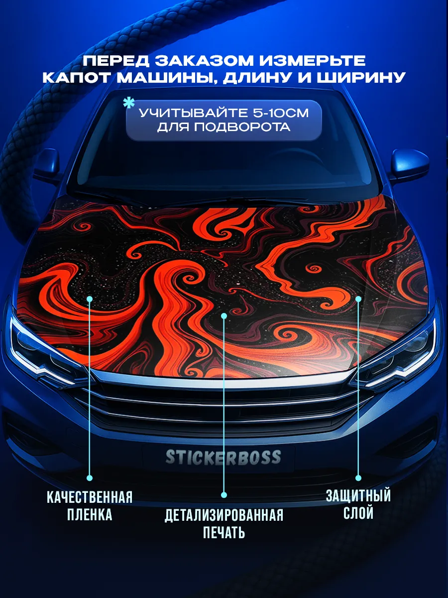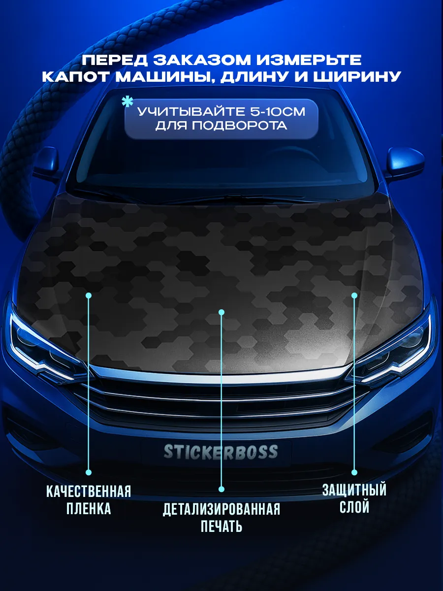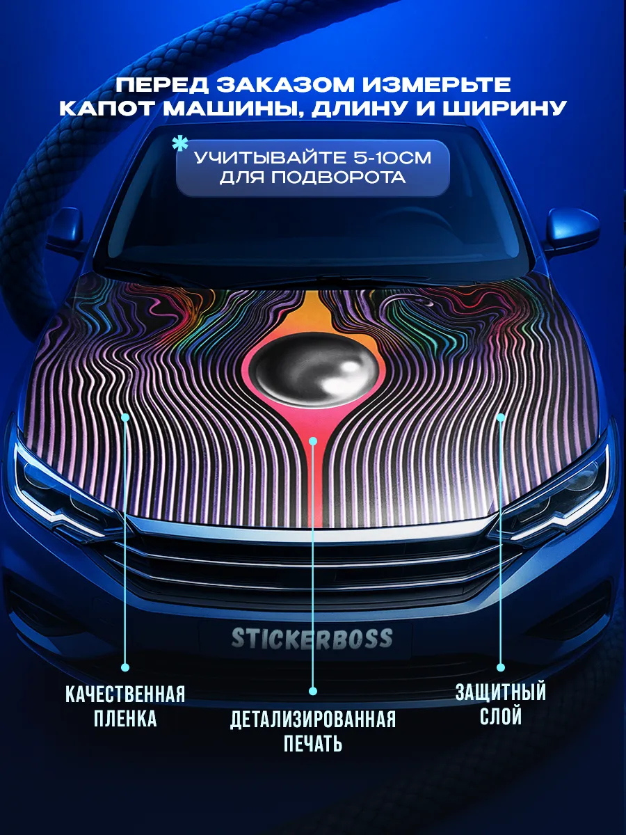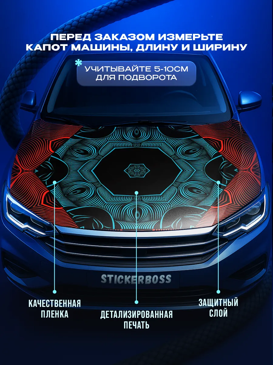 Предлагаем вашему вниманию большую декоративную наклейку на капот вашего авто. Размер стикера универсальный - 155х119 см, подойдет на капоты большинства популярных авто, будь то седан, хэтчбек или универсал. При необходимости можно подрезать лист под нужный размер. При изготовлении этих автонаклеек мы используем высококачественную самоклеящуюся виниловую пленку ПВХ, которая обеспечивает надежное приклеивание к поверхности, устойчива к любому виду моек и агрессивным погодным условиям, не боится пыли и влаги, не выгорает на солнце благодаря дополнительному верхнему слою ламинации. При желании, легко снимается, не оставляя следов. В наличии множество различных вариантов на любой вкус – в коллекции есть принты с надписями, героями известных кинофильмов, динамичные изображения львов, тигров, волков, медведей, леопардов, собак, лошадей, и прочих животных, принты в стиле аниме, флаги России, флаги известных футбольных клубов, горы, города, живописные пейзажи и многое другое. Наклейка позволяет украсить автомобиль и добавить ему стиля и индивидуальности, декорировать под ваши индивидуальные взгляды на дизайн машины. Товар упаковывается в специальную защитную тубу, что позволяет обеспечить его сохранность во время доставки и порадовать наших покупателей яркими красками и высоким качеством наших стикеров. Они так же станут отличным подарком вашим близким на новый год, день рождения, женщинам на 8 марта и мужчинам на 23 февраля. Сделайте повседневную езду на машине ярче, вместе с продукцией бренда Stickerboss!