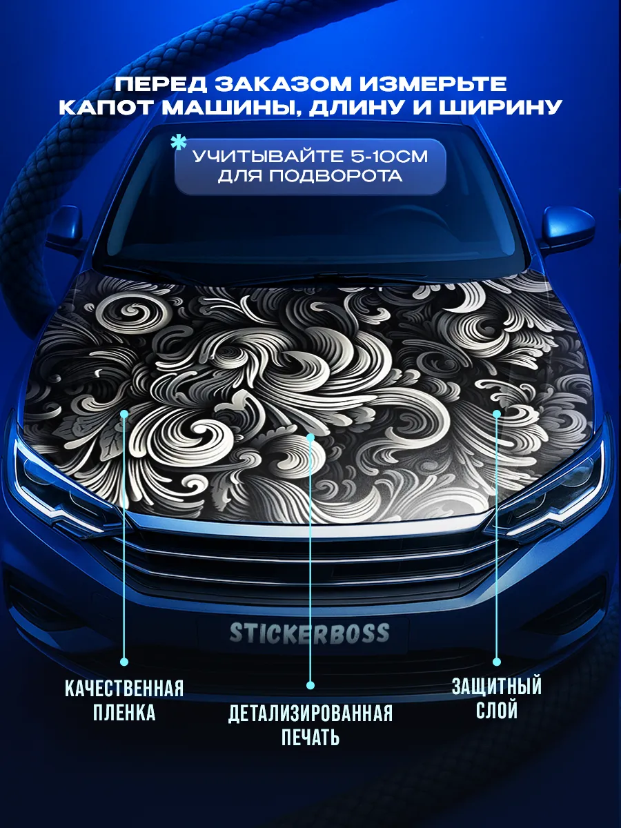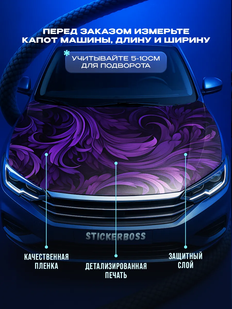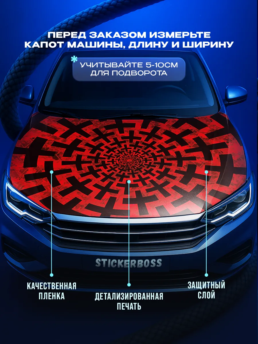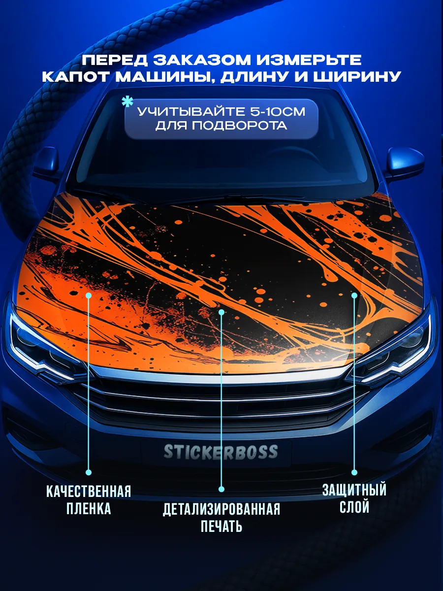 Предлагаем вашему вниманию большую декоративную наклейку на капот вашего авто. Размер стикера универсальный - 155х119 см, подойдет на капоты большинства популярных авто, будь то седан, хэтчбек или универсал. При необходимости можно подрезать лист под нужный размер. При изготовлении этих автонаклеек мы используем высококачественную самоклеящуюся виниловую пленку ПВХ, которая обеспечивает надежное приклеивание к поверхности, устойчива к любому виду моек и агрессивным погодным условиям, не боится пыли и влаги, не выгорает на солнце благодаря дополнительному верхнему слою ламинации. При желании, легко снимается, не оставляя следов. В наличии множество различных вариантов на любой вкус – в коллекции есть принты с надписями, героями известных кинофильмов, динамичные изображения львов, тигров, волков, медведей, леопардов, собак, лошадей, и прочих животных, принты в стиле аниме, флаги России, флаги известных футбольных клубов, горы, города, живописные пейзажи и многое другое. Наклейка позволяет украсить автомобиль и добавить ему стиля и индивидуальности, декорировать под ваши индивидуальные взгляды на дизайн машины. Товар упаковывается в специальную защитную тубу, что позволяет обеспечить его сохранность во время доставки и порадовать наших покупателей яркими красками и высоким качеством наших стикеров. Они так же станут отличным подарком вашим близким на новый год, день рождения, женщинам на 8 марта и мужчинам на 23 февраля. Сделайте повседневную езду на машине ярче, вместе с продукцией бренда Stickerboss!