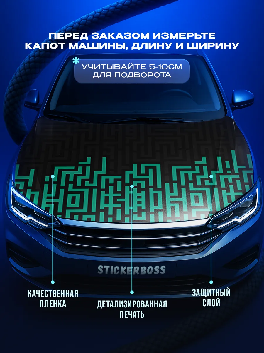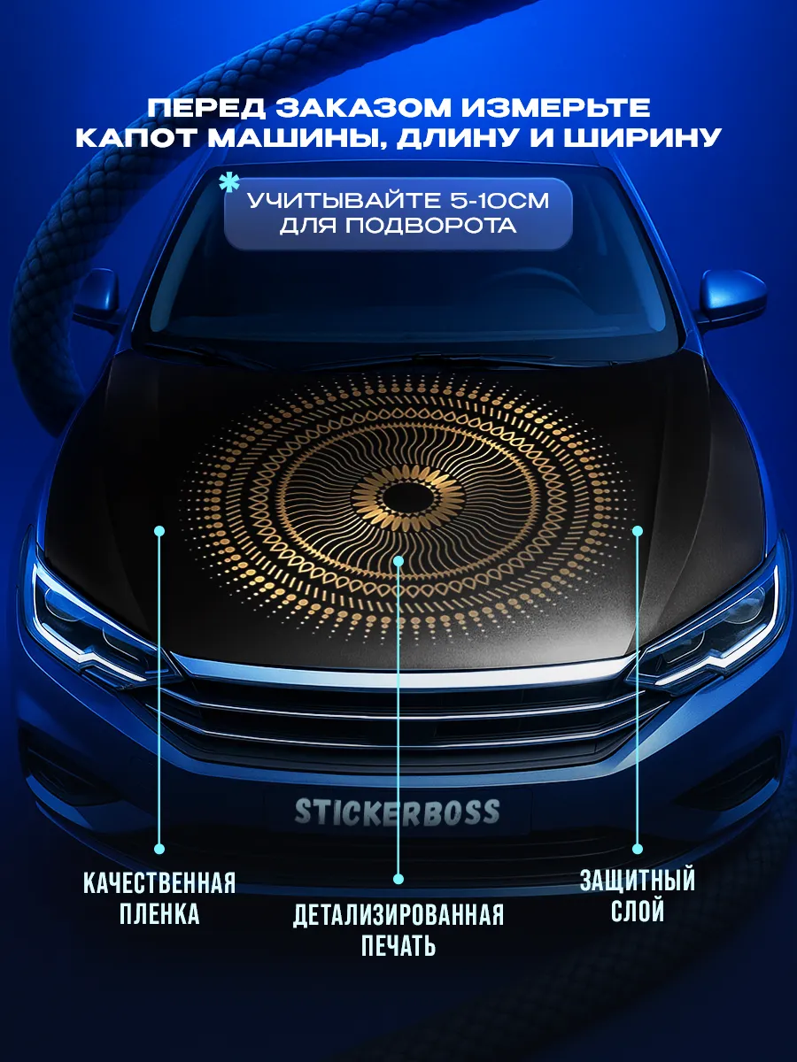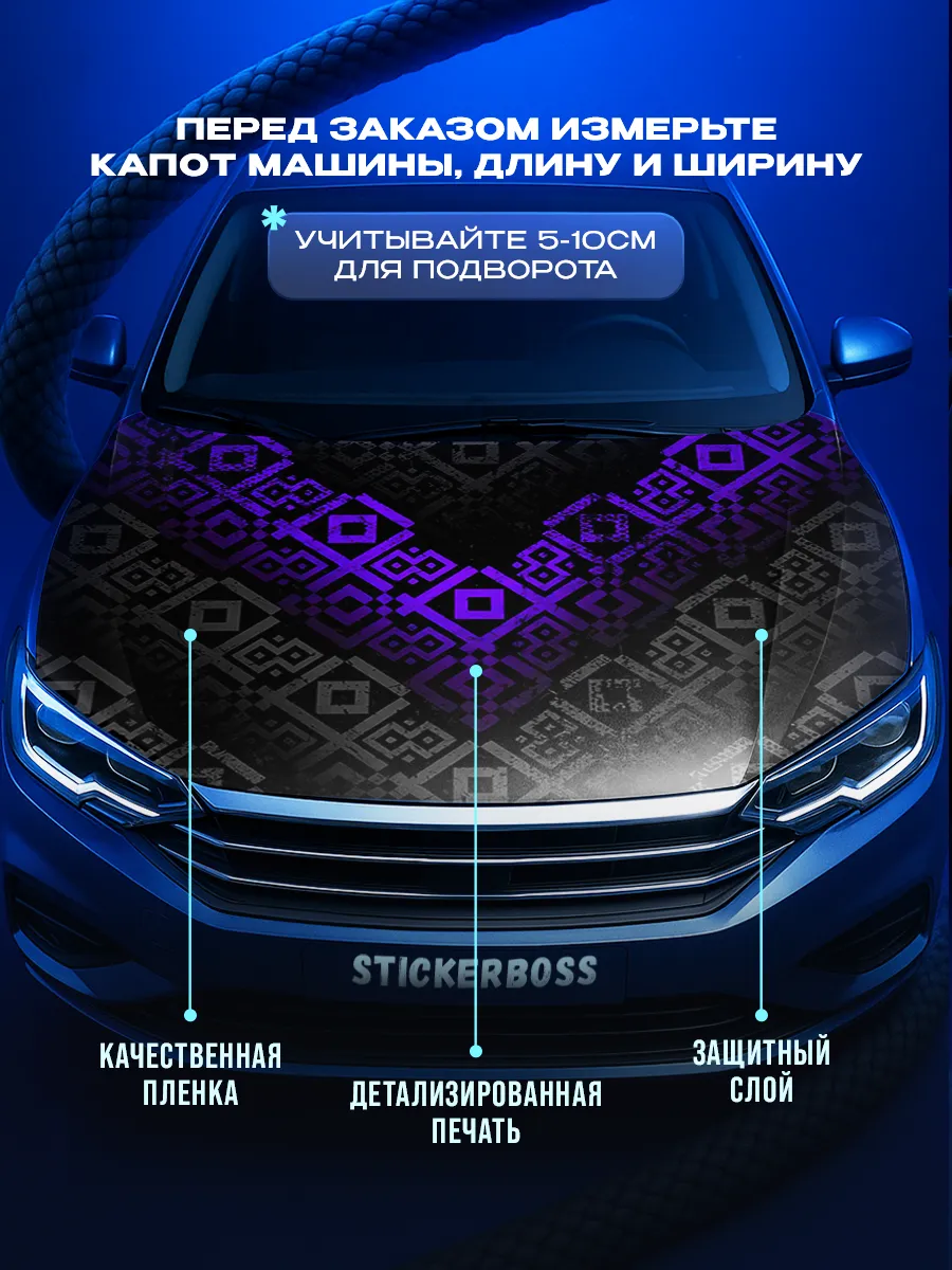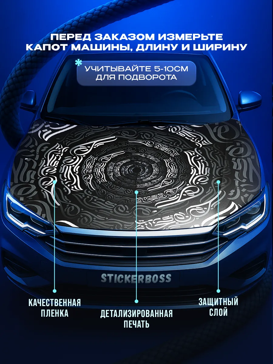 Предлагаем вашему вниманию большую декоративную наклейку на капот вашего авто. Размер стикера универсальный - 155х119 см, подойдет на капоты большинства популярных авто, будь то седан, хэтчбек или универсал. При необходимости можно подрезать лист под нужный размер. При изготовлении этих автонаклеек мы используем высококачественную самоклеящуюся виниловую пленку ПВХ, которая обеспечивает надежное приклеивание к поверхности, устойчива к любому виду моек и агрессивным погодным условиям, не боится пыли и влаги, не выгорает на солнце благодаря дополнительному верхнему слою ламинации. При желании, легко снимается, не оставляя следов. В наличии множество различных вариантов на любой вкус – в коллекции есть принты с надписями, героями известных кинофильмов, динамичные изображения львов, тигров, волков, медведей, леопардов, собак, лошадей, и прочих животных, принты в стиле аниме, флаги России, флаги известных футбольных клубов, горы, города, живописные пейзажи и многое другое. Наклейка позволяет украсить автомобиль и добавить ему стиля и индивидуальности, декорировать под ваши индивидуальные взгляды на дизайн машины. Товар упаковывается в специальную защитную тубу, что позволяет обеспечить его сохранность во время доставки и порадовать наших покупателей яркими красками и высоким качеством наших стикеров. Они так же станут отличным подарком вашим близким на новый год, день рождения, женщинам на 8 марта и мужчинам на 23 февраля. Сделайте повседневную езду на машине ярче, вместе с продукцией бренда Stickerboss!