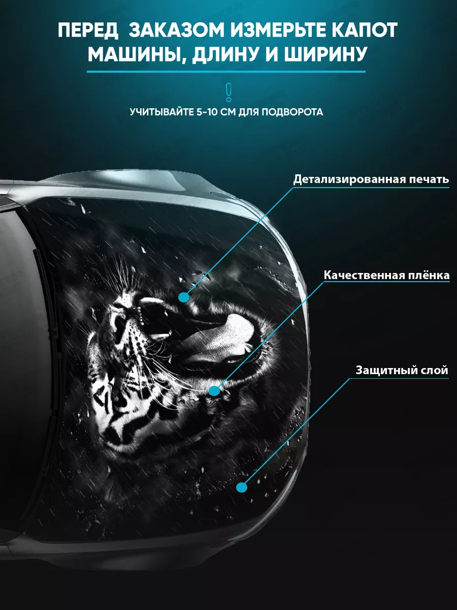 Предлагаем вашему вниманию большую декоративную наклейку на капот вашего авто. Размер стикера универсальный - 155х119 см, подойдет на капоты большинства популярных авто, будь то седан, хэтчбек или универсал. При необходимости можно подрезать лист под нужный размер. При изготовлении этих автонаклеек мы используем высококачественную самоклеящуюся виниловую пленку ПВХ, которая обеспечивает надежное приклеивание к поверхности, устойчива к любому виду моек и агрессивным погодным условиям, не боится пыли и влаги, не выгорает на солнце благодаря дополнительному верхнему слою ламинации. При желании, легко снимается, не оставляя следов. В наличии множество различных вариантов на любой вкус – в коллекции есть принты с надписями, героями известных кинофильмов, динамичные изображения львов, тигров, волков, медведей, леопардов, собак, лошадей, и прочих животных, принты в стиле аниме, флаги России, флаги известных футбольных клубов, горы, города, живописные пейзажи и многое другое. Наклейка позволяет украсить автомобиль и добавить ему стиля и индивидуальности, декорировать под ваши индивидуальные взгляды на дизайн машины. Товар упаковывается в специальную защитную тубу, что позволяет обеспечить его сохранность во время доставки и порадовать наших покупателей яркими красками и высоким качеством наших стикеров. Они так же станут отличным подарком вашим близким на новый год, день рождения, женщинам на 8 марта и мужчинам на 23 февраля. Сделайте повседневную езду на машине ярче, вместе с продукцией бренда Stickerboss!