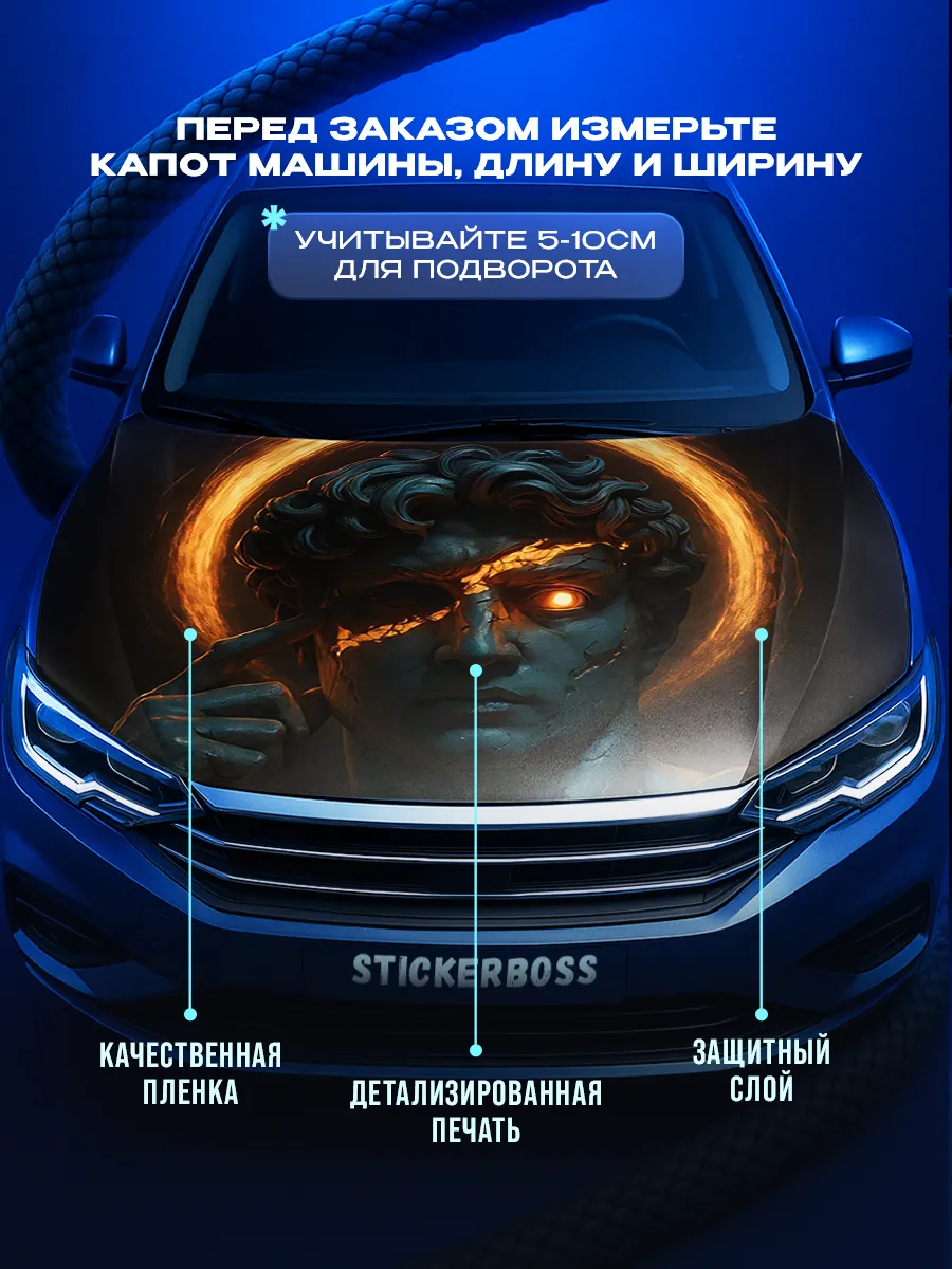 Предлагаем вашему вниманию большую декоративную наклейку на капот вашего авто. Размер стикера универсальный - 155х119 см, подойдет на капоты большинства популярных авто, будь то седан, хэтчбек или универсал. При необходимости можно подрезать лист под нужный размер. При изготовлении этих автонаклеек мы используем высококачественную самоклеящуюся виниловую пленку ПВХ, которая обеспечивает надежное приклеивание к поверхности, устойчива к любому виду моек и агрессивным погодным условиям, не боится пыли и влаги, не выгорает на солнце благодаря дополнительному верхнему слою ламинации. При желании, легко снимается, не оставляя следов. В наличии множество различных вариантов на любой вкус – в коллекции есть принты с надписями, героями известных кинофильмов, динамичные изображения львов, тигров, волков, медведей, леопардов, собак, лошадей, и прочих животных, принты в стиле аниме, флаги России, флаги известных футбольных клубов, горы, города, живописные пейзажи и многое другое. Наклейка позволяет украсить автомобиль и добавить ему стиля и индивидуальности, декорировать под ваши индивидуальные взгляды на дизайн машины. Товар упаковывается в специальную защитную тубу, что позволяет обеспечить его сохранность во время доставки и порадовать наших покупателей яркими красками и высоким качеством наших стикеров. Они так же станут отличным подарком вашим близким на новый год, день рождения, женщинам на 8 марта и мужчинам на 23 февраля. Сделайте повседневную езду на машине ярче, вместе с продукцией бренда Stickerboss!