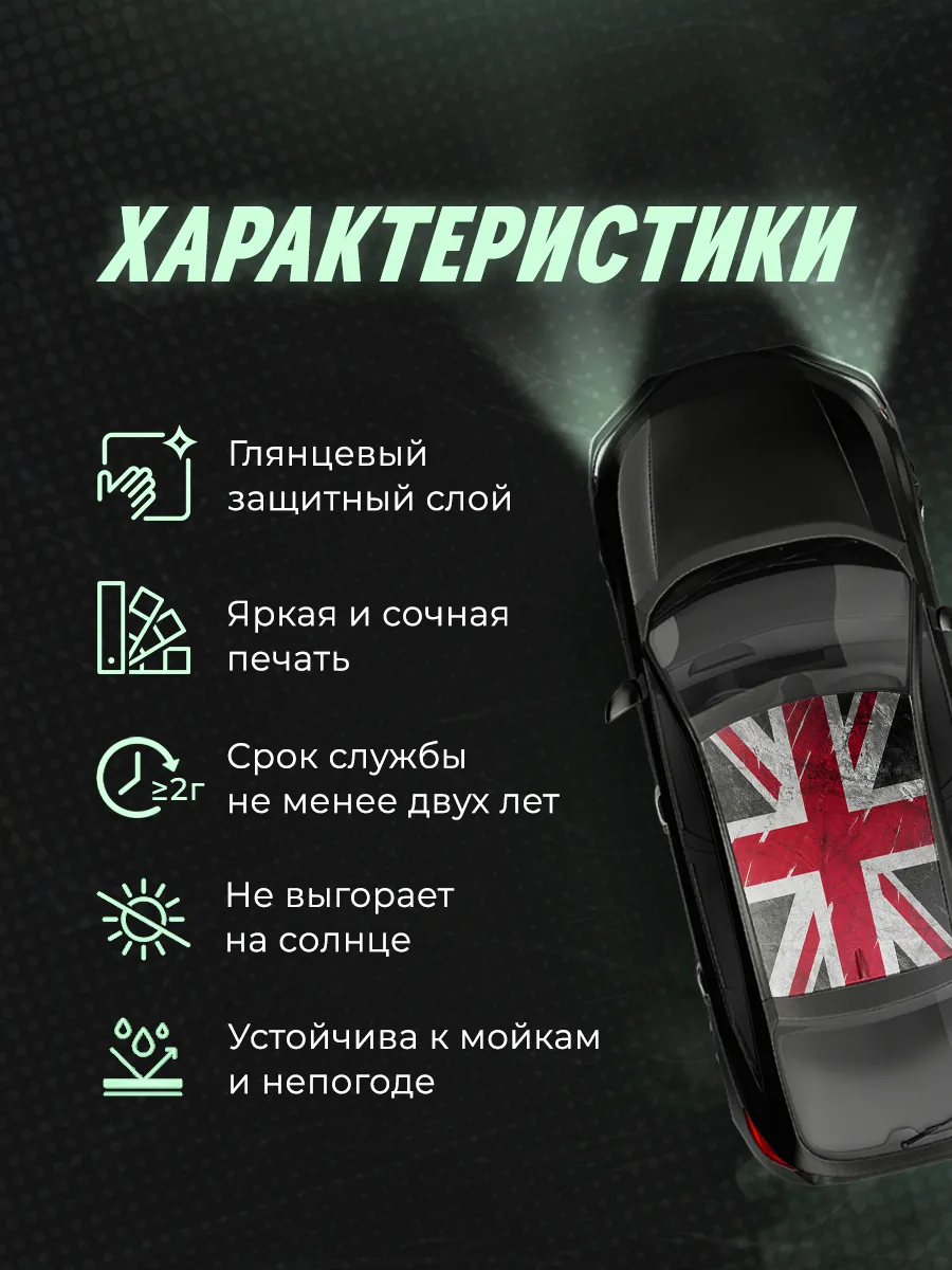 Откройте для себя уникальную коллекцию наклеек размером 200х118 см на крышу автомобиля, которая превратит ваше транспортное средство в объект восхищения и удивления, а внешний тюнинг автомобиля - в приятное и увлекательное занятие. В нашем ассортименте вы найдете разнообразные принты, от ярких флагов до кадров из культовых фильмов, а также оригинальные узоры. Эти автонаклейки не только подчеркнут вашу индивидуальность, но и помогут выделиться на дороге. Высококачественные материалы автомобильных аксессуаров обеспечивают долговечность и стойкость стикеров к выгоранию, сохраняя яркость и насыщенность цветов. Легкость в установке гарантирует, что преобразить свой автомобиль сможет каждый автолюбитель. Превратите крышу вашего авто в произведение искусства с нашей эксклюзивной коллекцией!