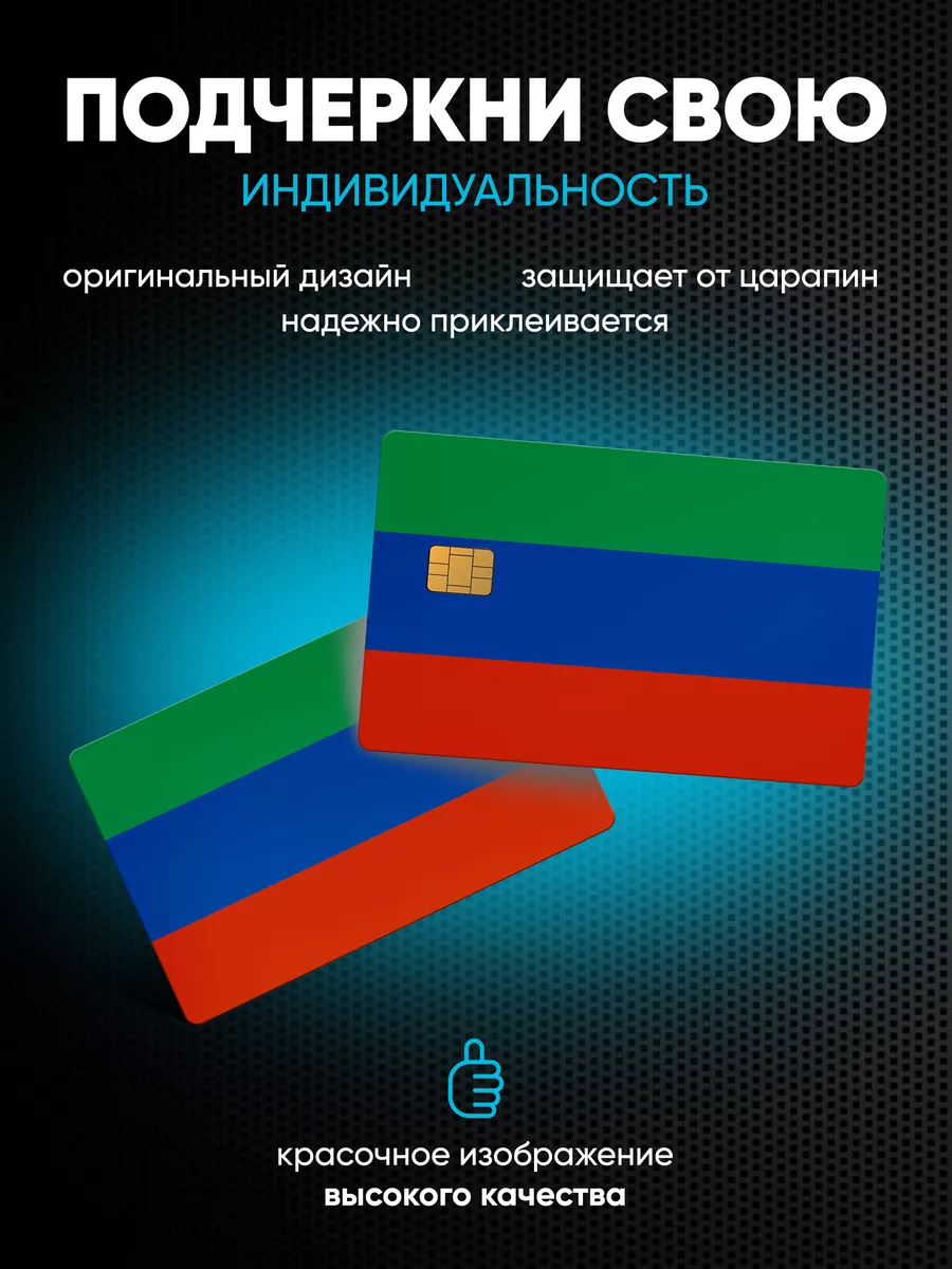 Наклейки на банковскую карту Дагестан от Stickerboss представляют собой практичный способ персонализации и защиты вашего платежного инструмента. Комплект состоит из двух наклеек, изготовленных на самоклеящейся виниловой пленке ПВХ Oracal. Изображение выполнено в духе национальных флагов и гербов, сохраняется ярким и долговечным на протяжении длительного времени и не мешает бесконтактной оплате. На лицевой части наклейки сделана прорезь под чип, что обеспечивает удобство использования карты.