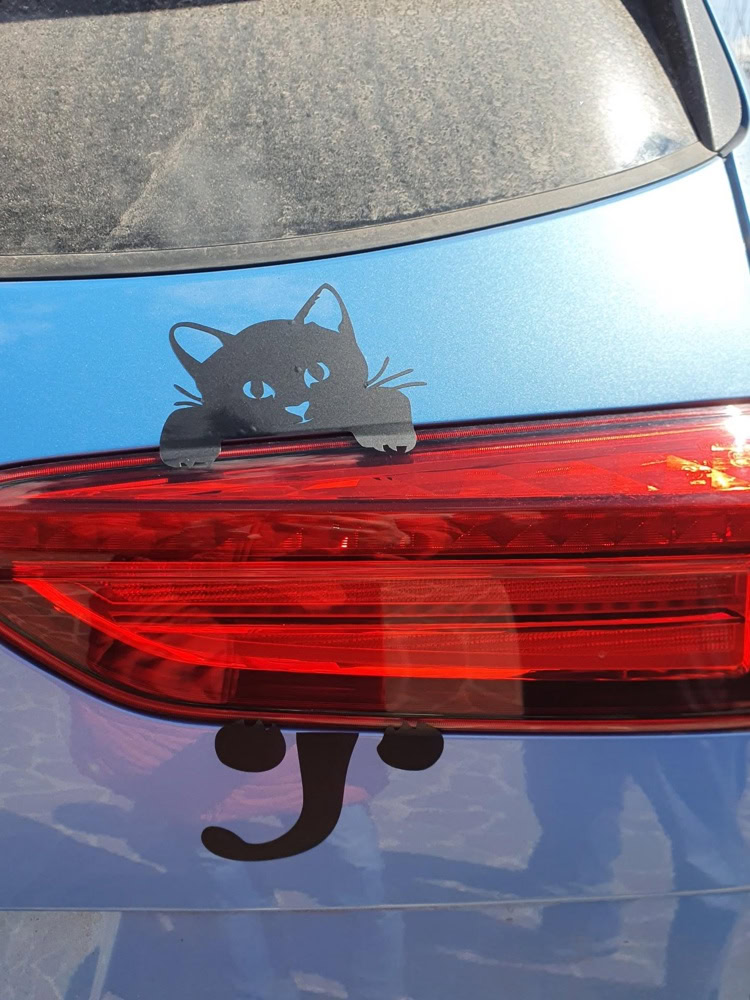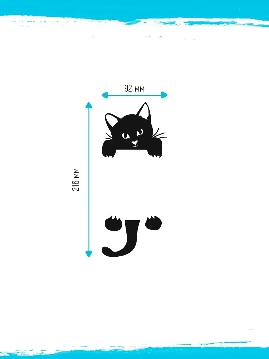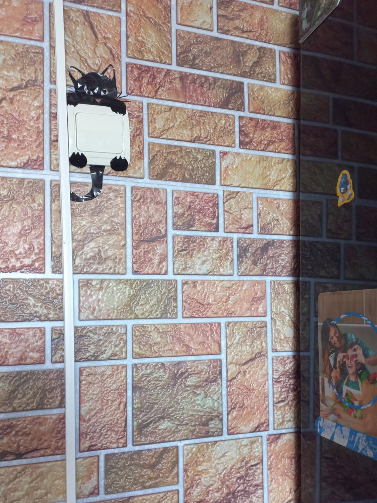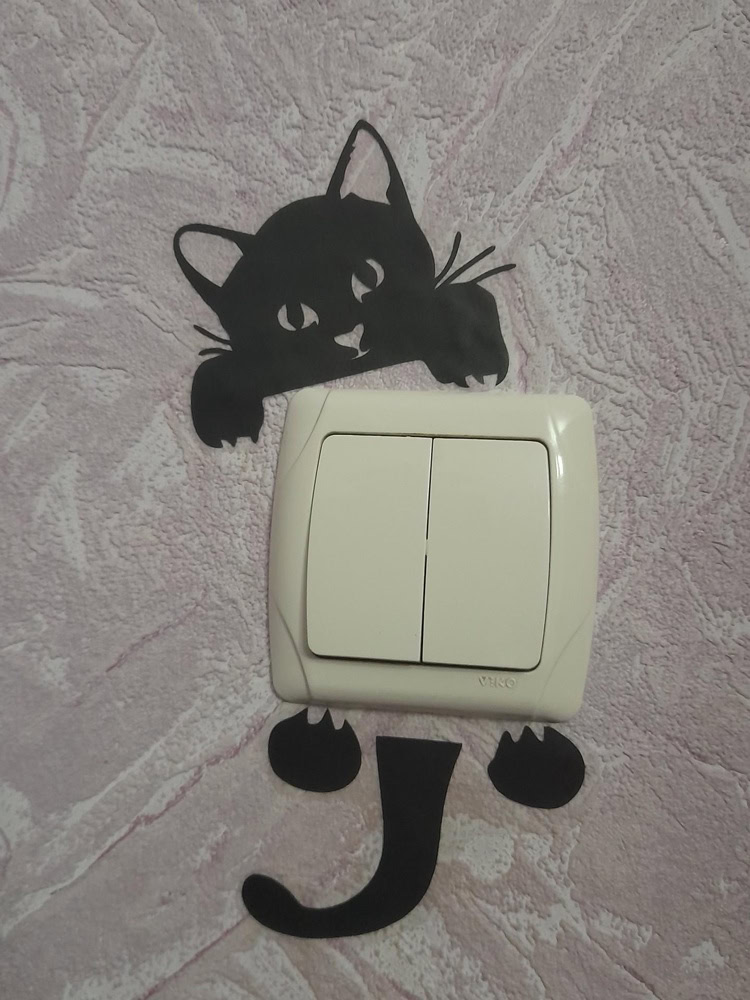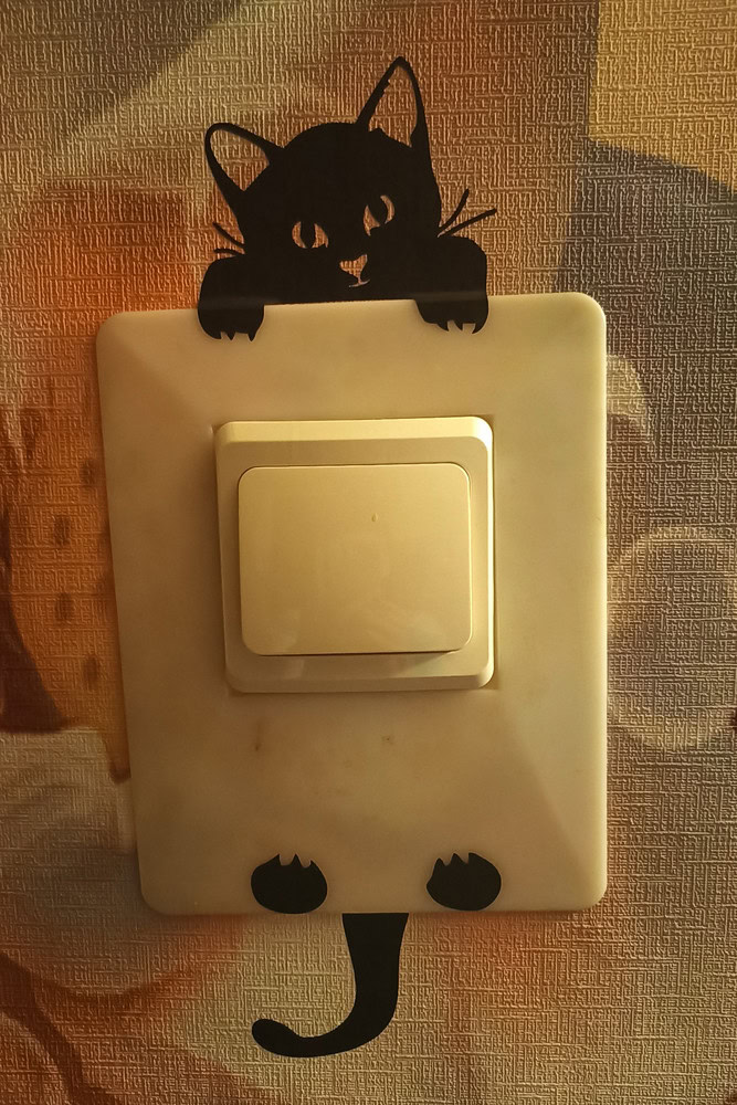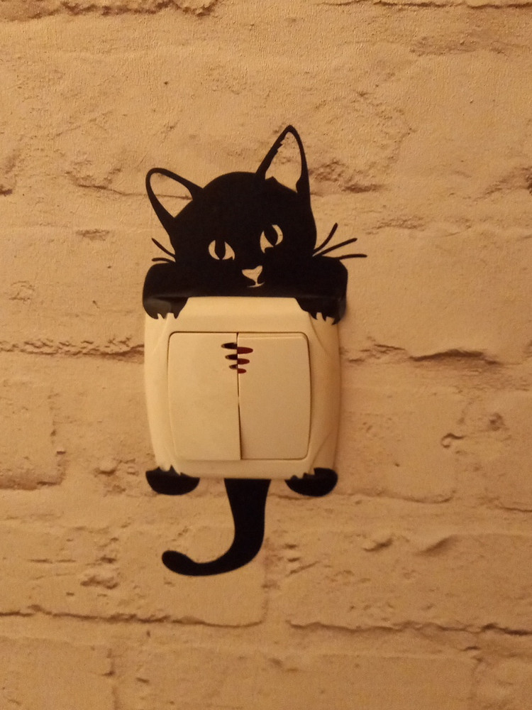 Наклейку легко разместить на чистой, сухой поверхности. Для достижения эффекта котика надписи, верхняя часть наклейки крепится сверху розетки, а нижняя — снизу, создавая иллюзию «висения» котика.