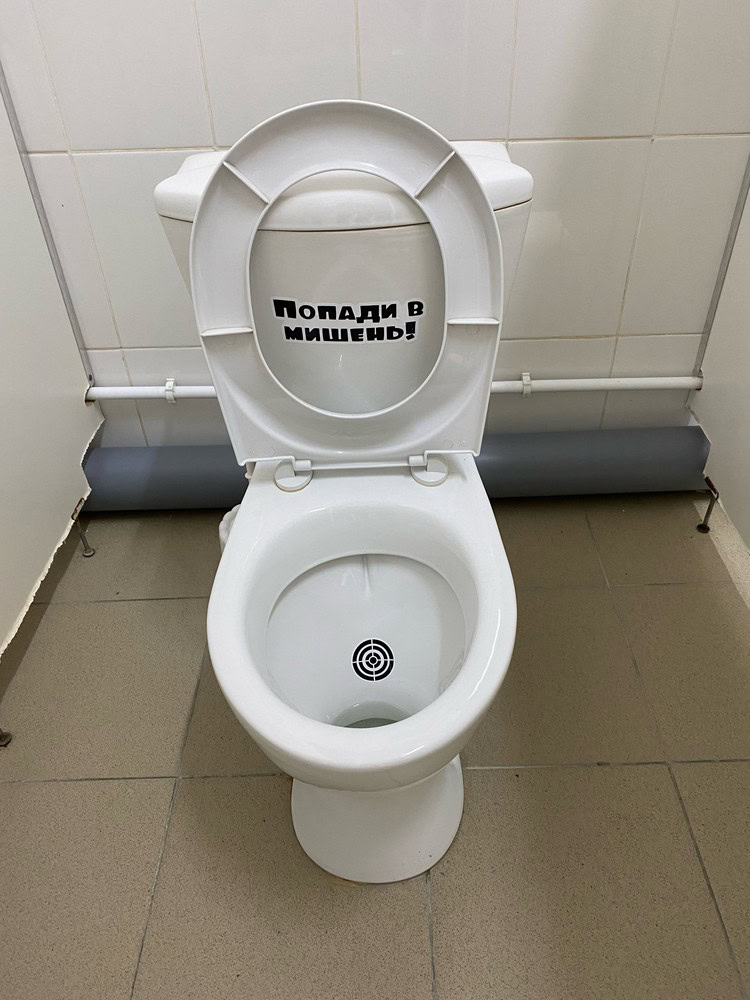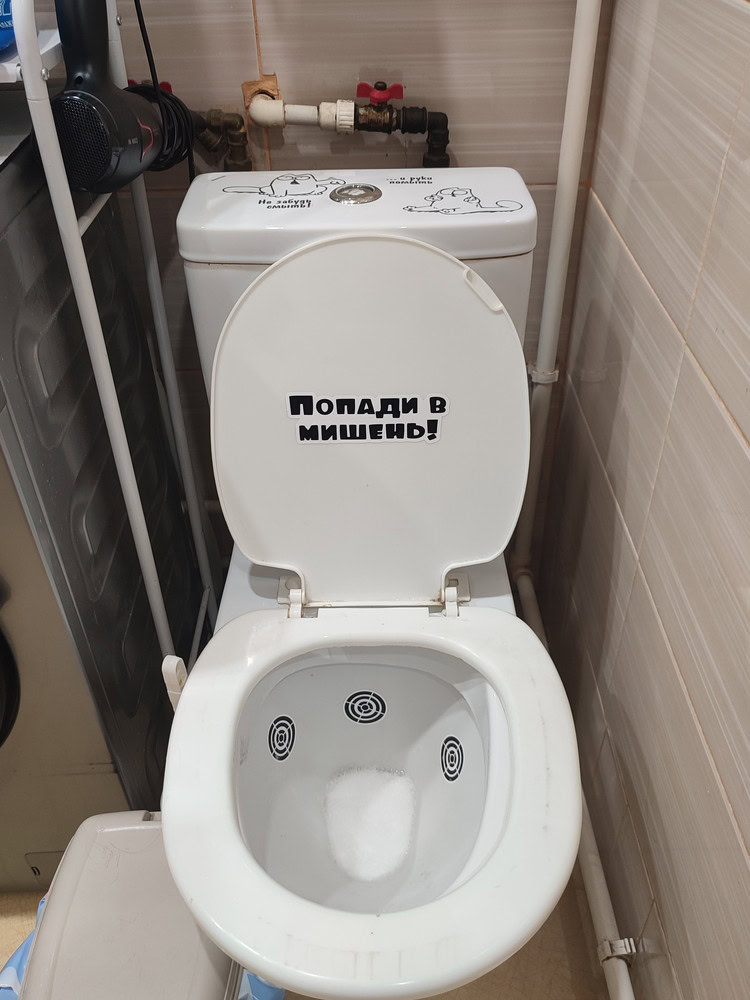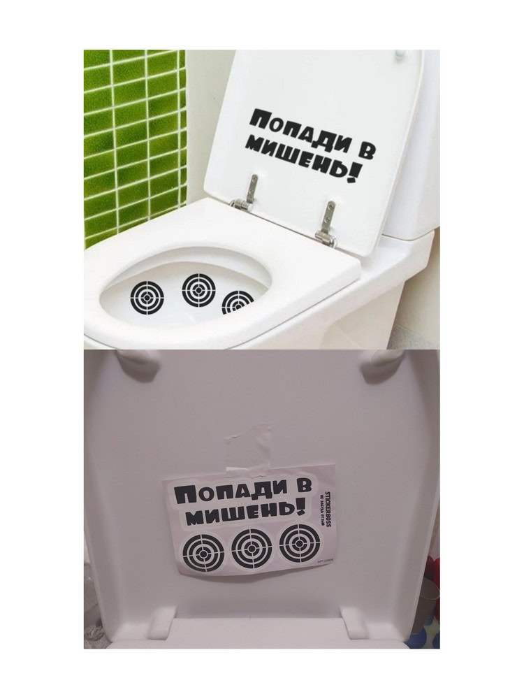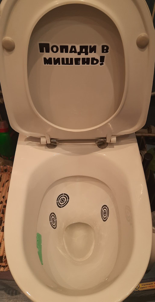 - на крышке унитаза размещена надпись, а в комплект входят три ярких мишени;